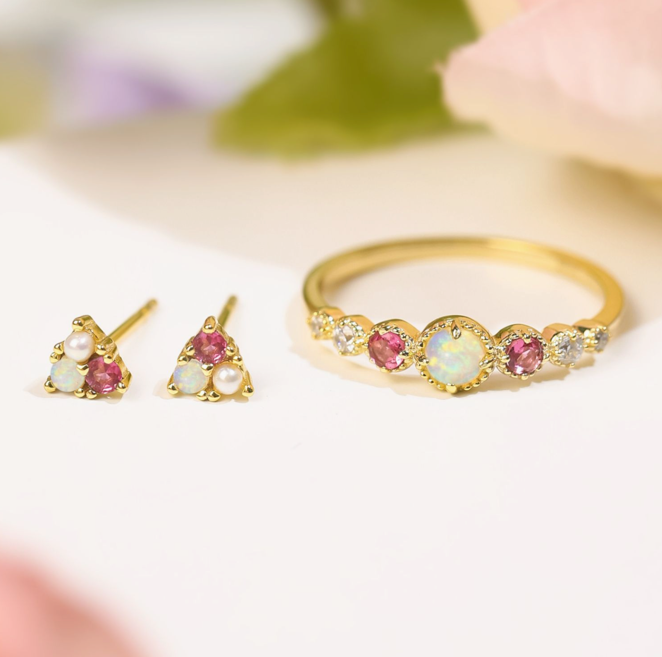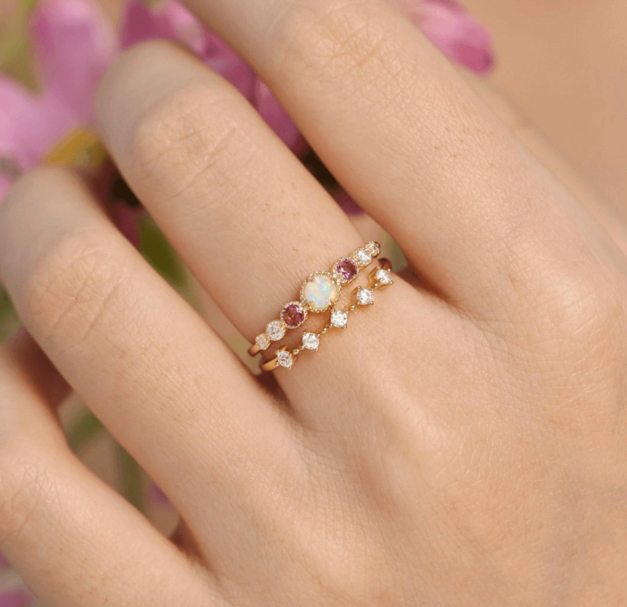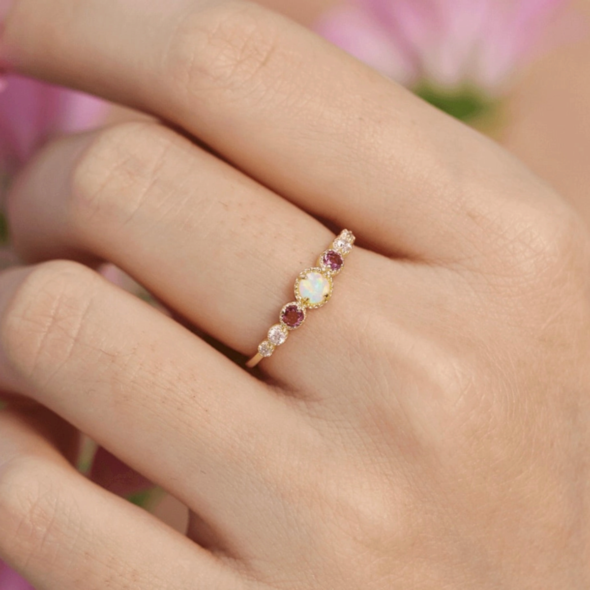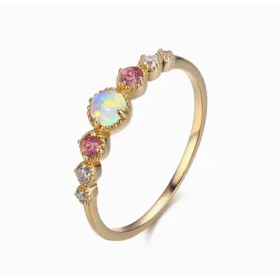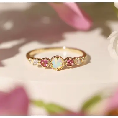 Crafted to give you that positive celestial vibe - the ring has the Opal daintily sited and beaming like a full moon, while gravitating towards the Pink Tourmaline and Moissanite to give you a supernatural sparkle.