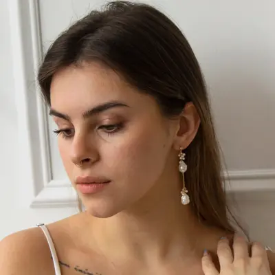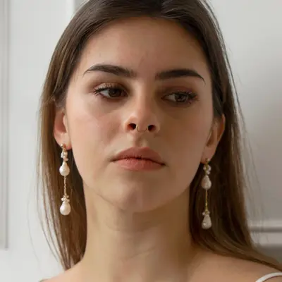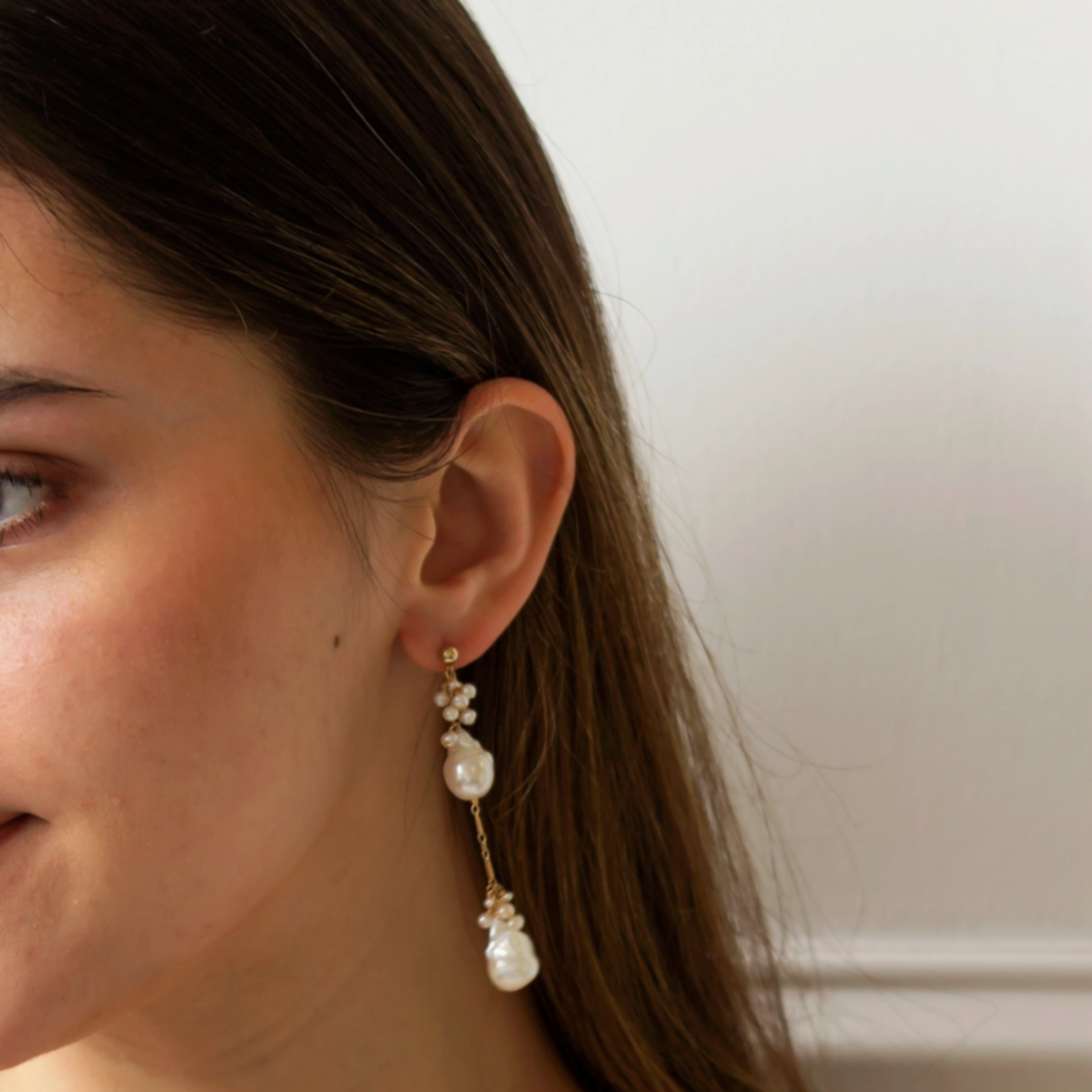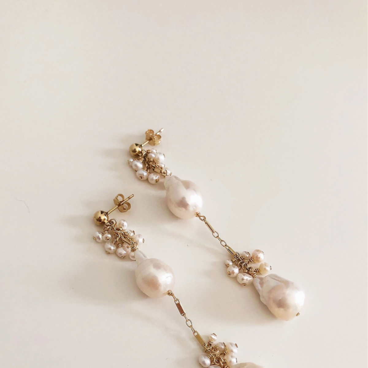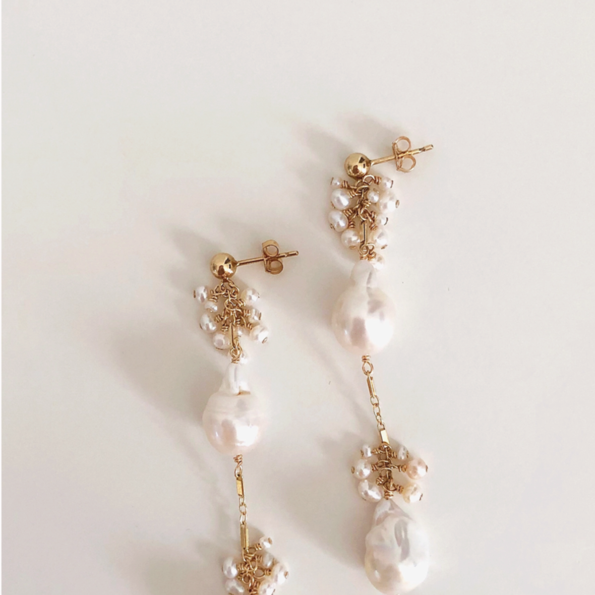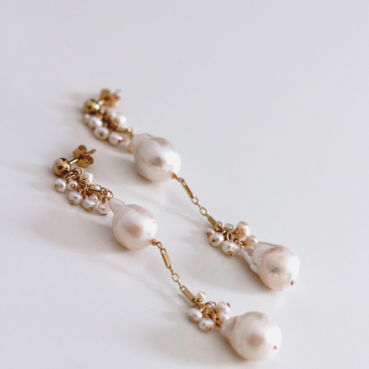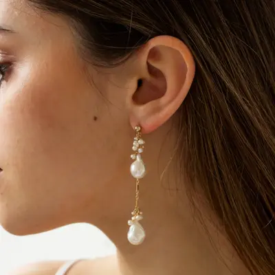 These earrings feature two genuine baroque freshwater pearls suspended from a dainty chain, adorned with signature freshwater pearl clustering. They make a great statement while still being comfortable to wear. Comfortable to wear.