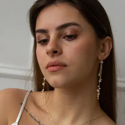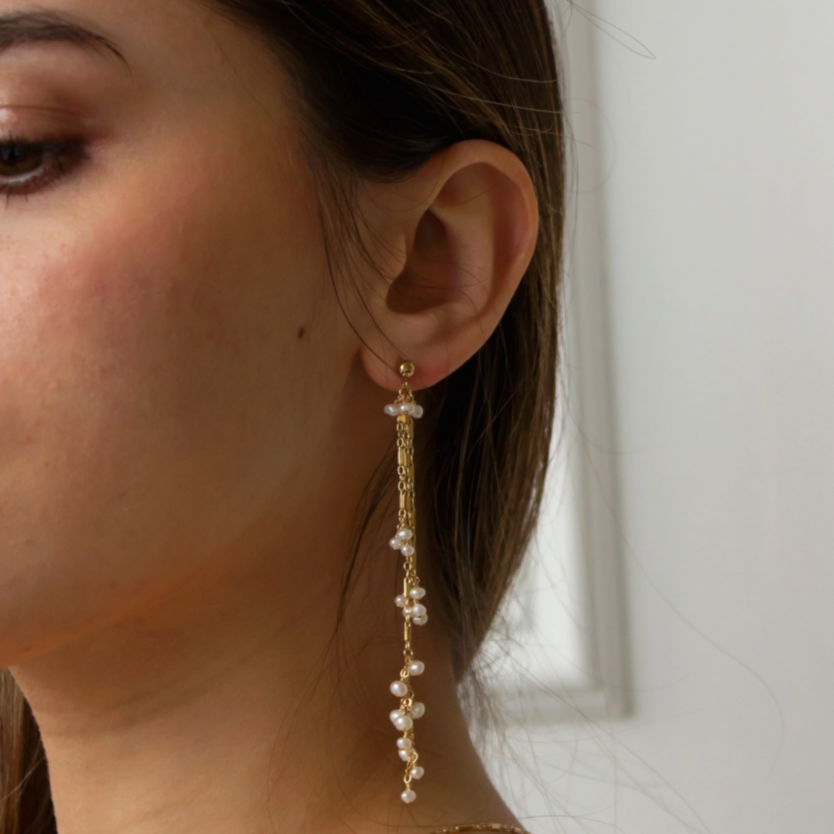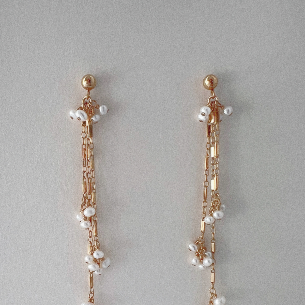 A triple strand earring with sporadic signature clustering in freshwater pearls. Dainty and long, this wispy style earring features posts. Lightweight and comfortable to wear.