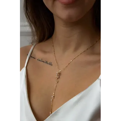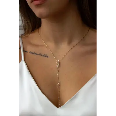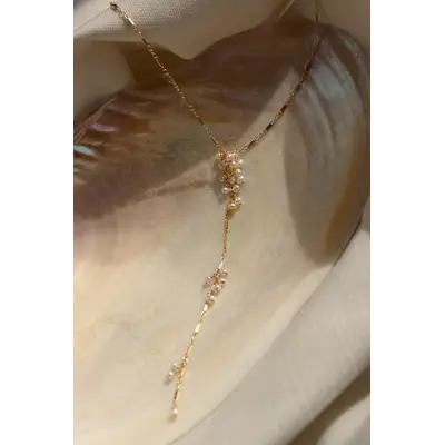 A dainty Y-necklace with sporadic signature clustering in freshwater pearls. Dainty and long, this wispy style gives a modern approach to a pearl necklace. Lightweight and comfortable to wear.