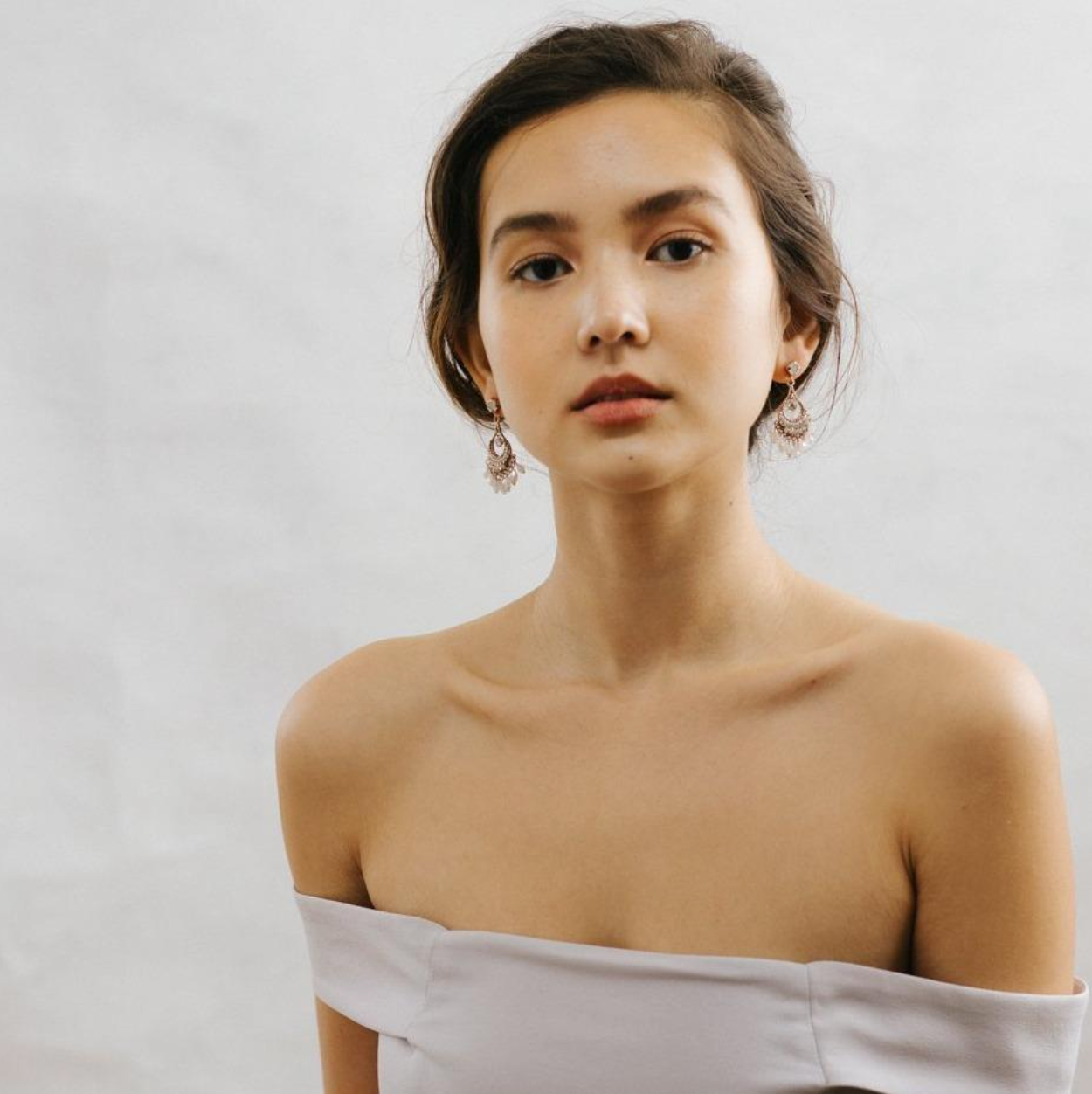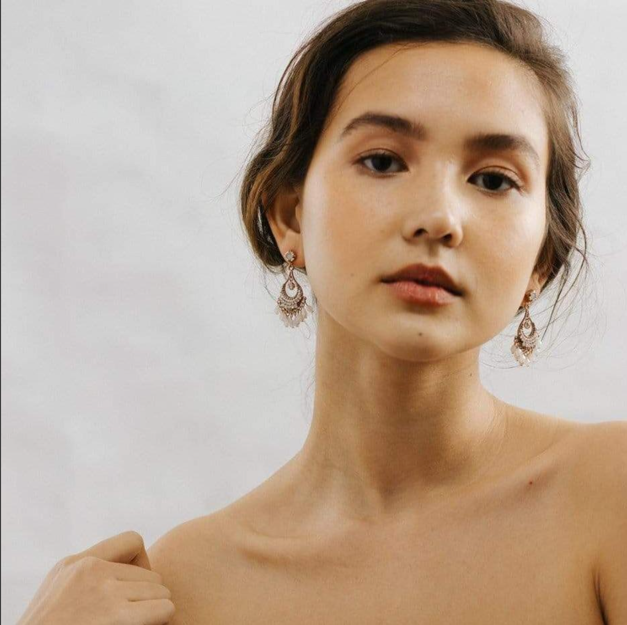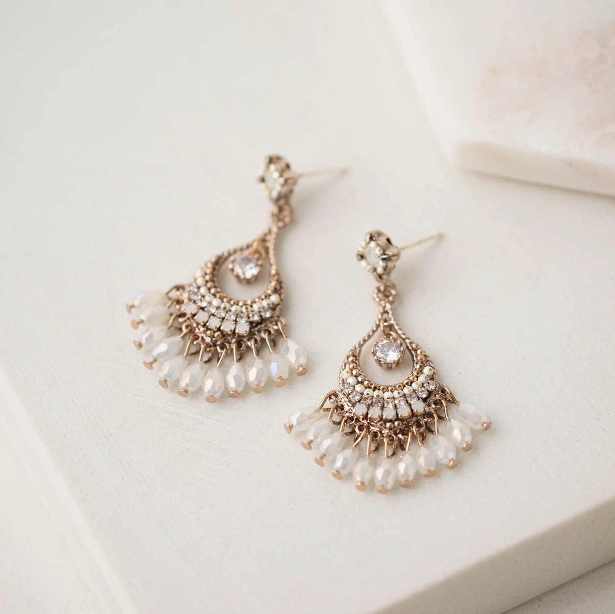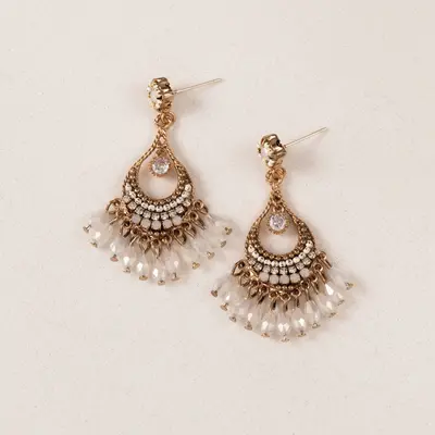 Hello, Coco. Where organic shapes meet design, these earrings feature iridescent opal, clear beads, and crystals enriched by a teardrop golden frame. Rich in detail, every curve, and placement of the gems meet their purpose.