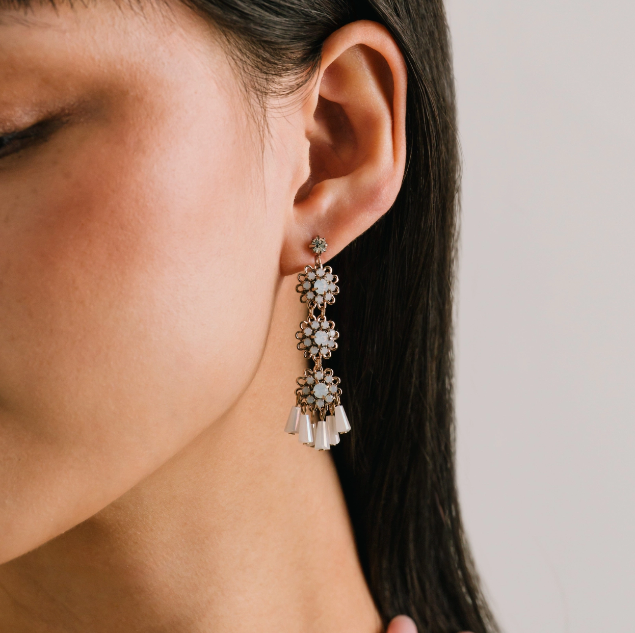The Daisy Chain Drop Earrings feature a 2-inch drop design crafted from plated brass and steel, accented with crystal beads, and finished with sterling silver posts for comfortable wear. Designed to sway gently with movement, these chain drop earrings add visual interest while remaining easy to style from day to night.