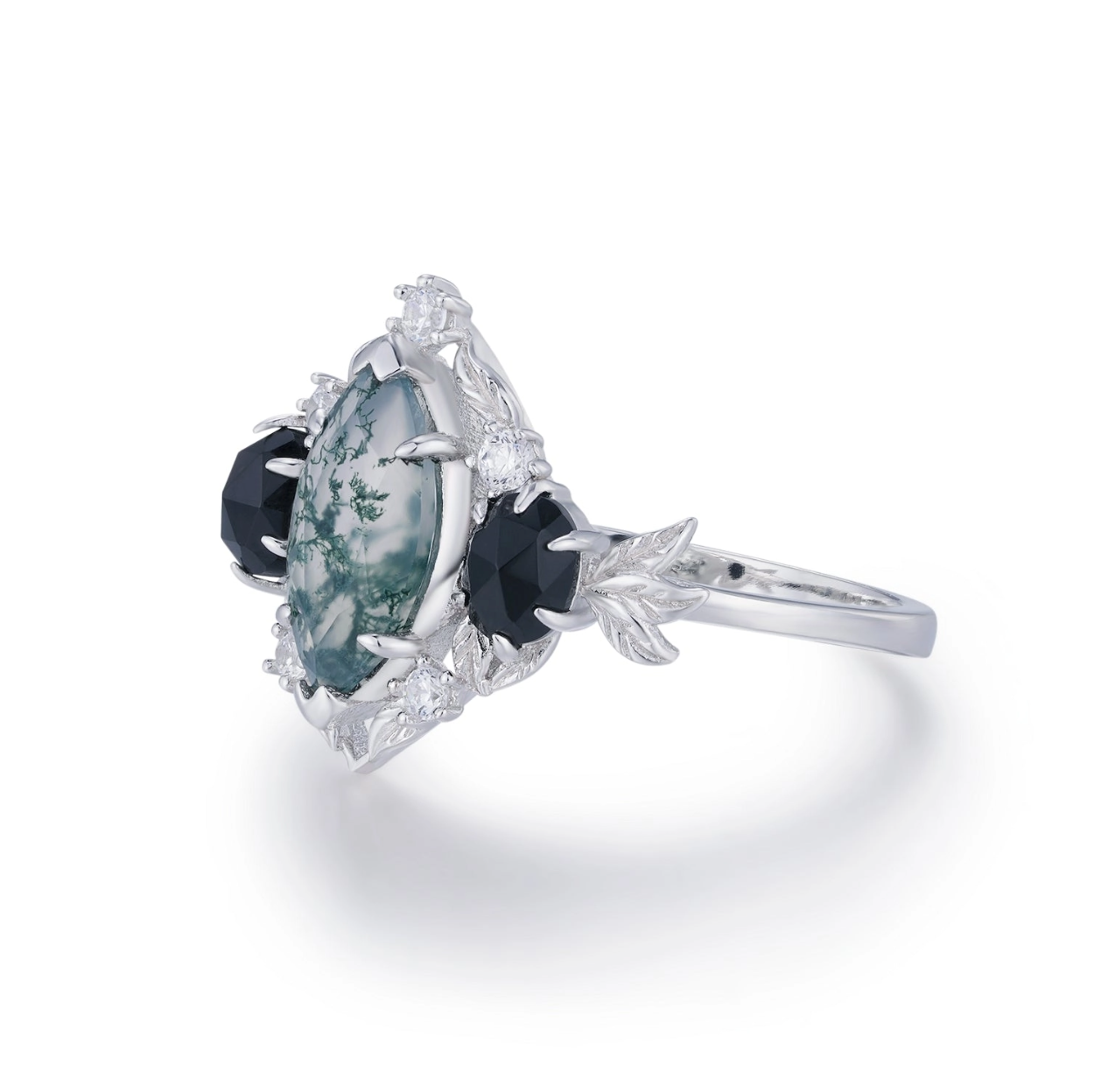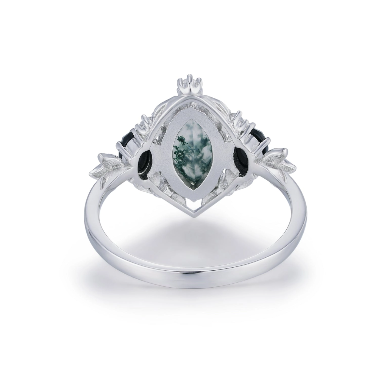 - Center Stone: 10x5mm marquise Moss Agate