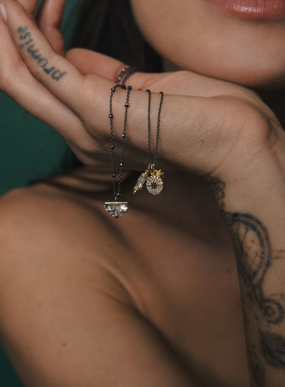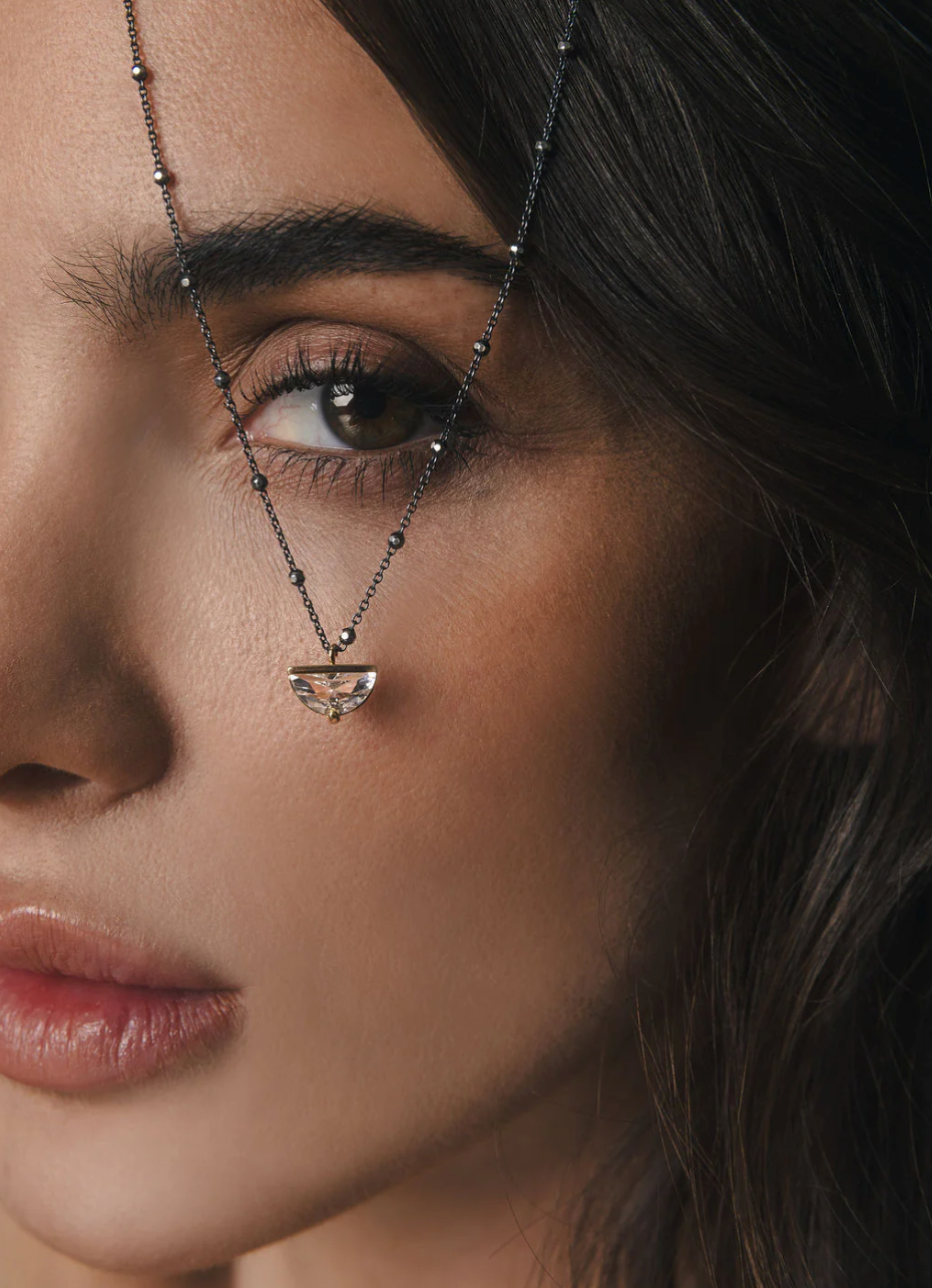 A pretty little crystal enhances the brilliance of this purdy pendant necklace. The perfect piece worn alone or for layering. Also available in oxidized sterling