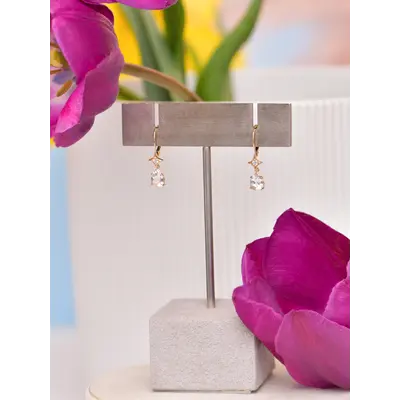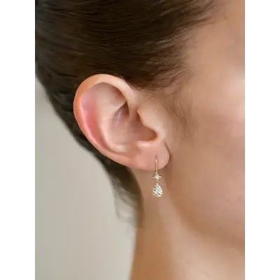 The Emilia Gothic Star Pear Drop Earrings feature clear topaz gemstones that dangle from elegant 14K solid yellow gold French clips. The clear, crystalline glow of the topaz paired with the handcrafted star detail makes them a versatile statement for both everyday luxury and special occasions.