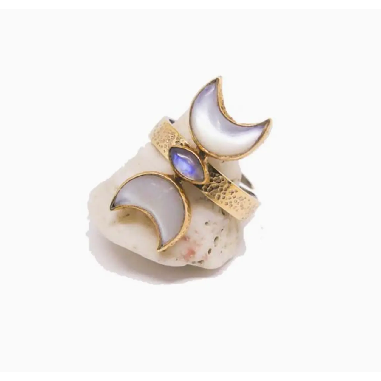 Featuring Moonstone in its design, this Moonlight Ring represents new beginnings. Moonstone is a crystal of inner growth and strength. This magical gem soothes emotional instability and stress. Shell is used to enhance our intuition and imagination