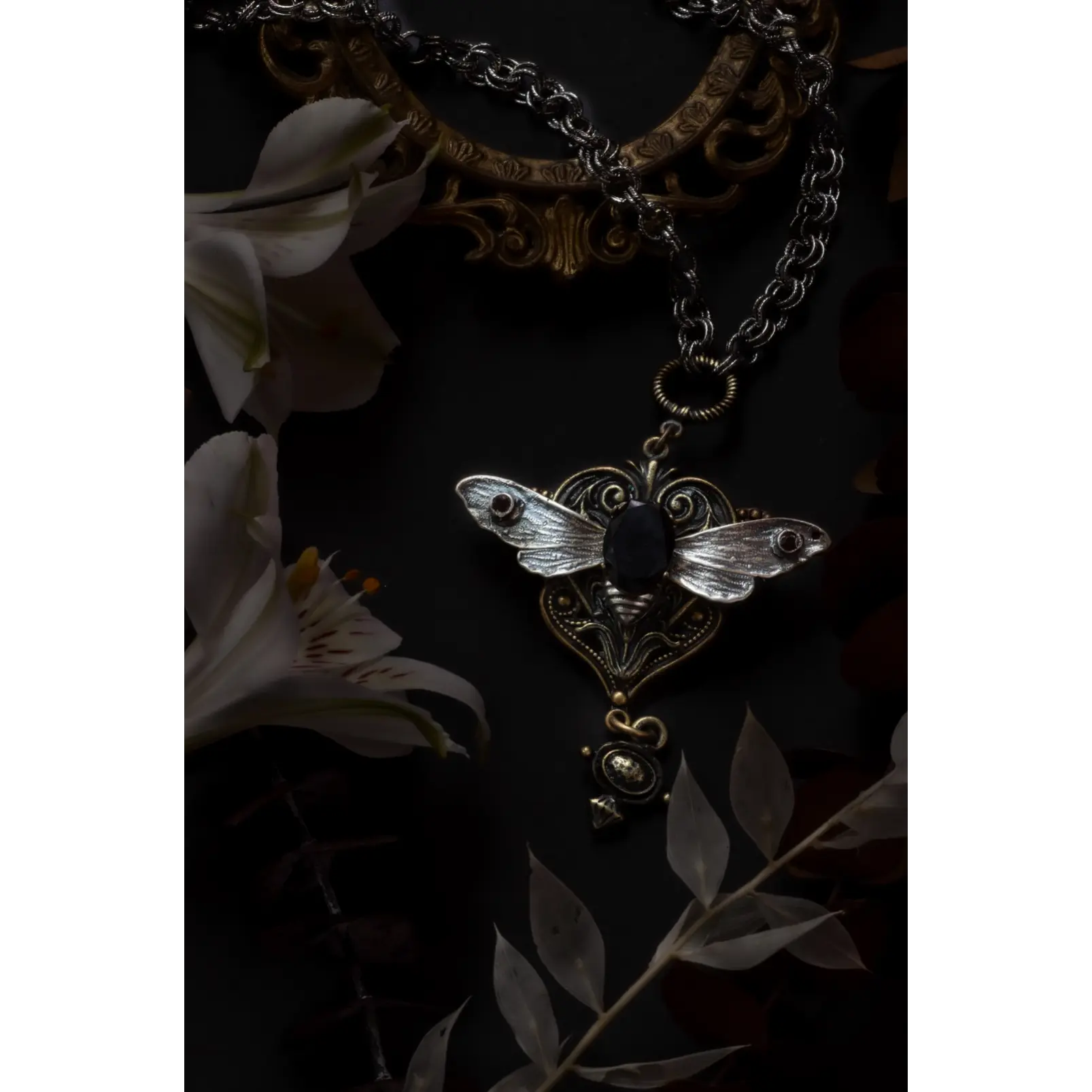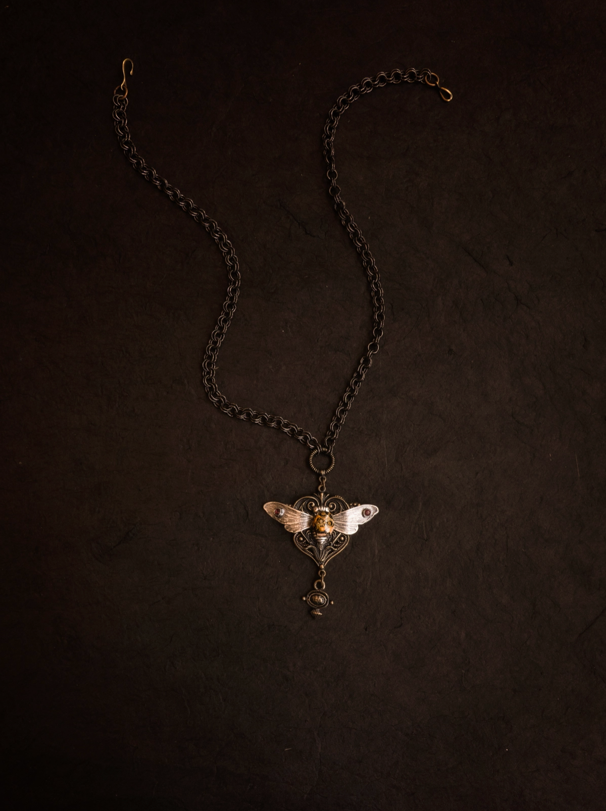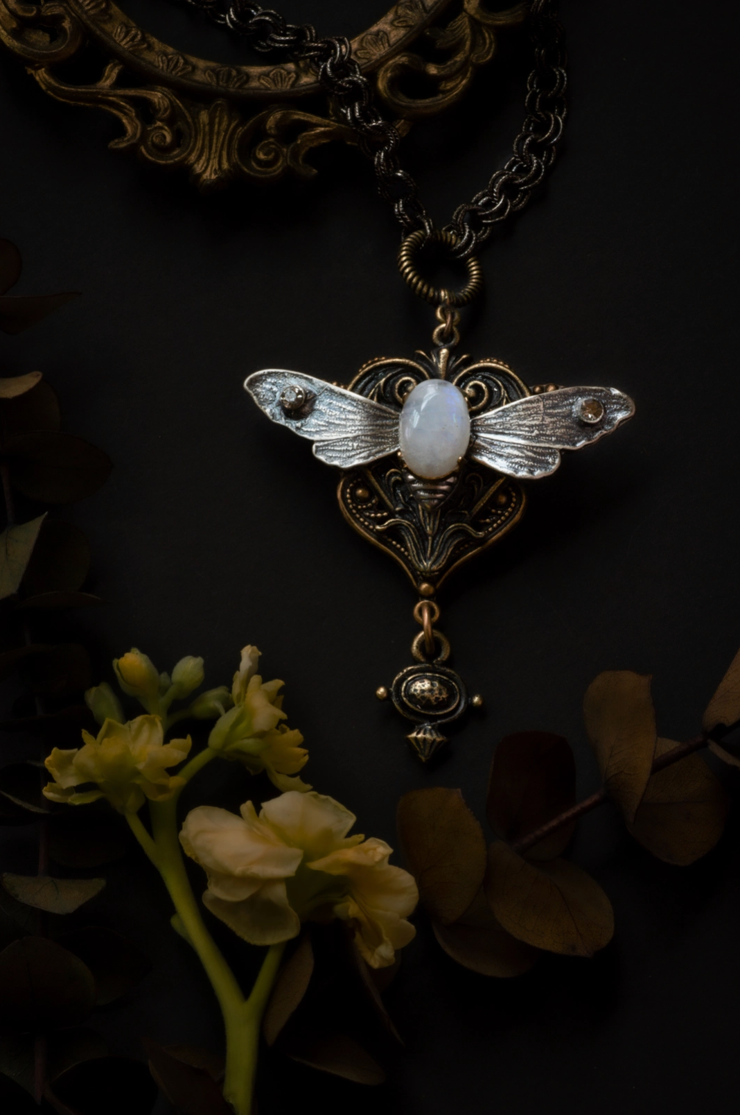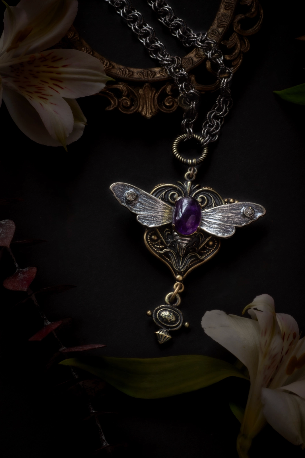 An ancient devotee of cycles, cicada sings with the endless rhythm of dissolving and re-forming. From sapdreaming nymphs nourished by buried roots to chitin creatures bursting forth, she cants her song through the depths of time. On this planchette-style amulet, cicada is crowned with a luminous gemstone cabochon and flanked by twin rhinestones, Wear it as an invocation of cycles both within and without and a prayer to the mysteries lodged between what has ended and what is yet to begin.