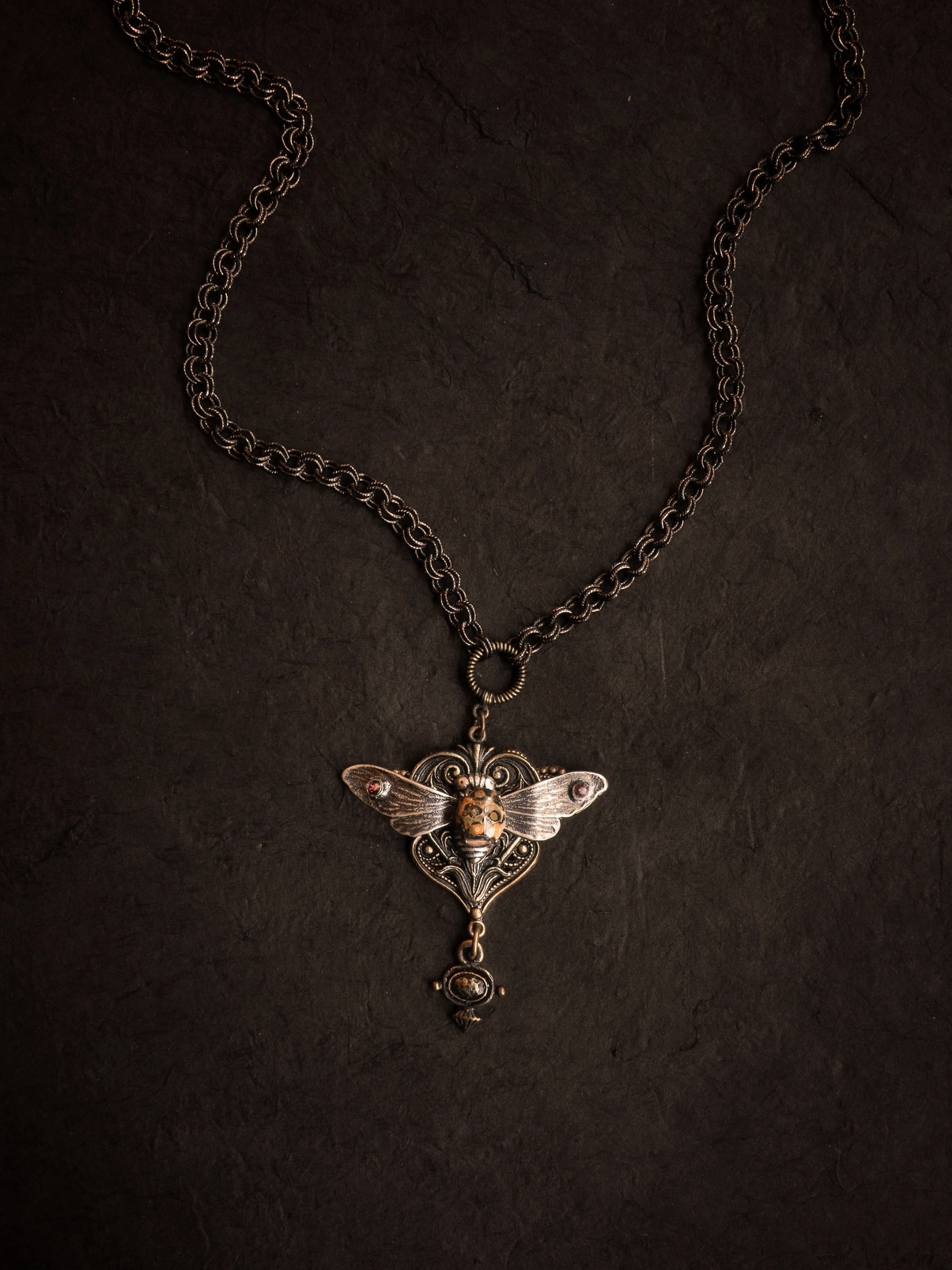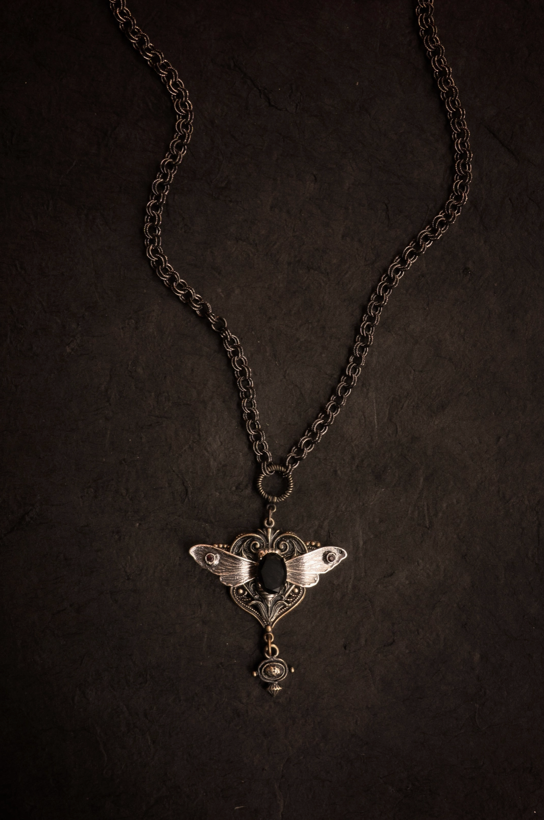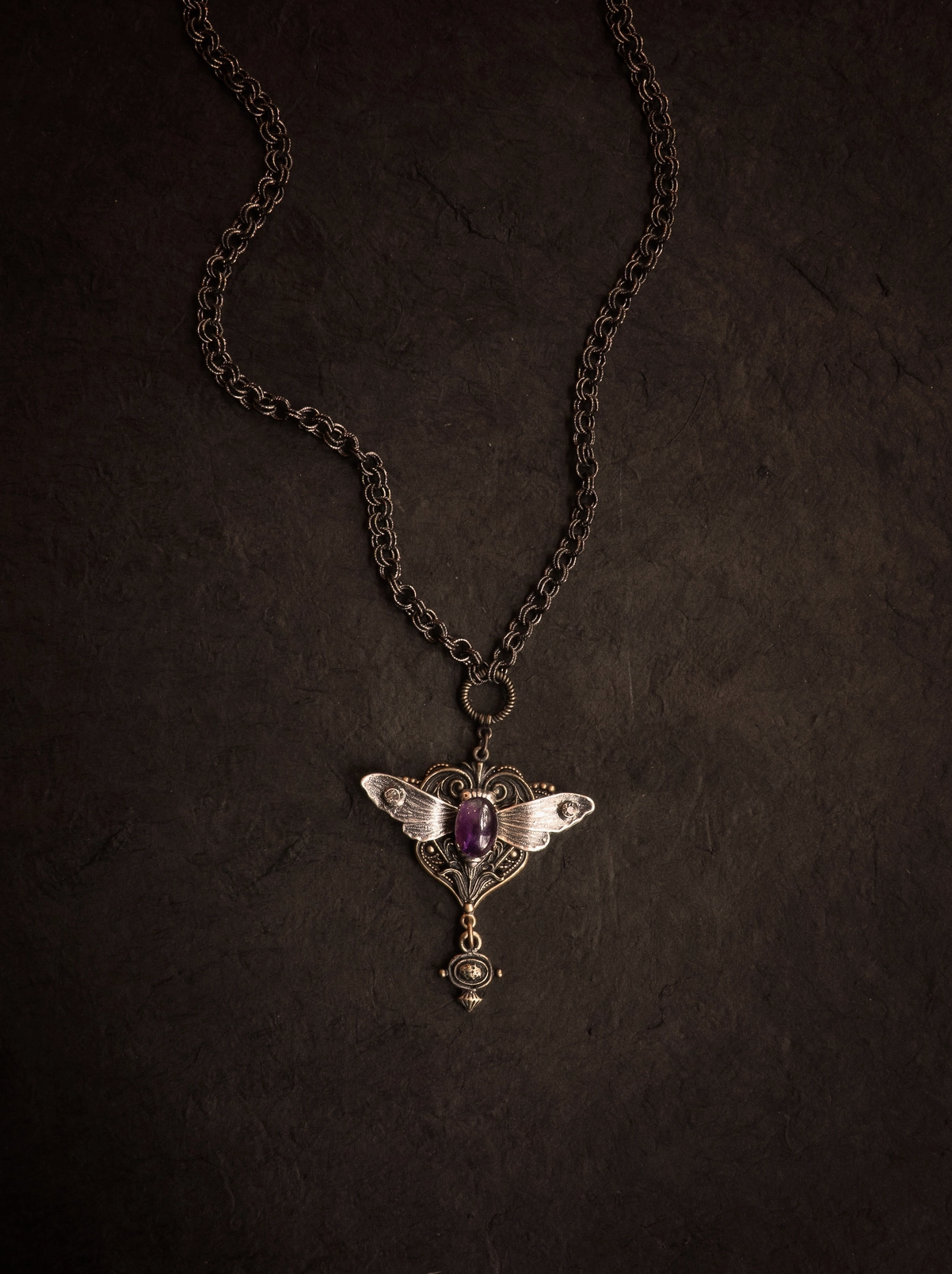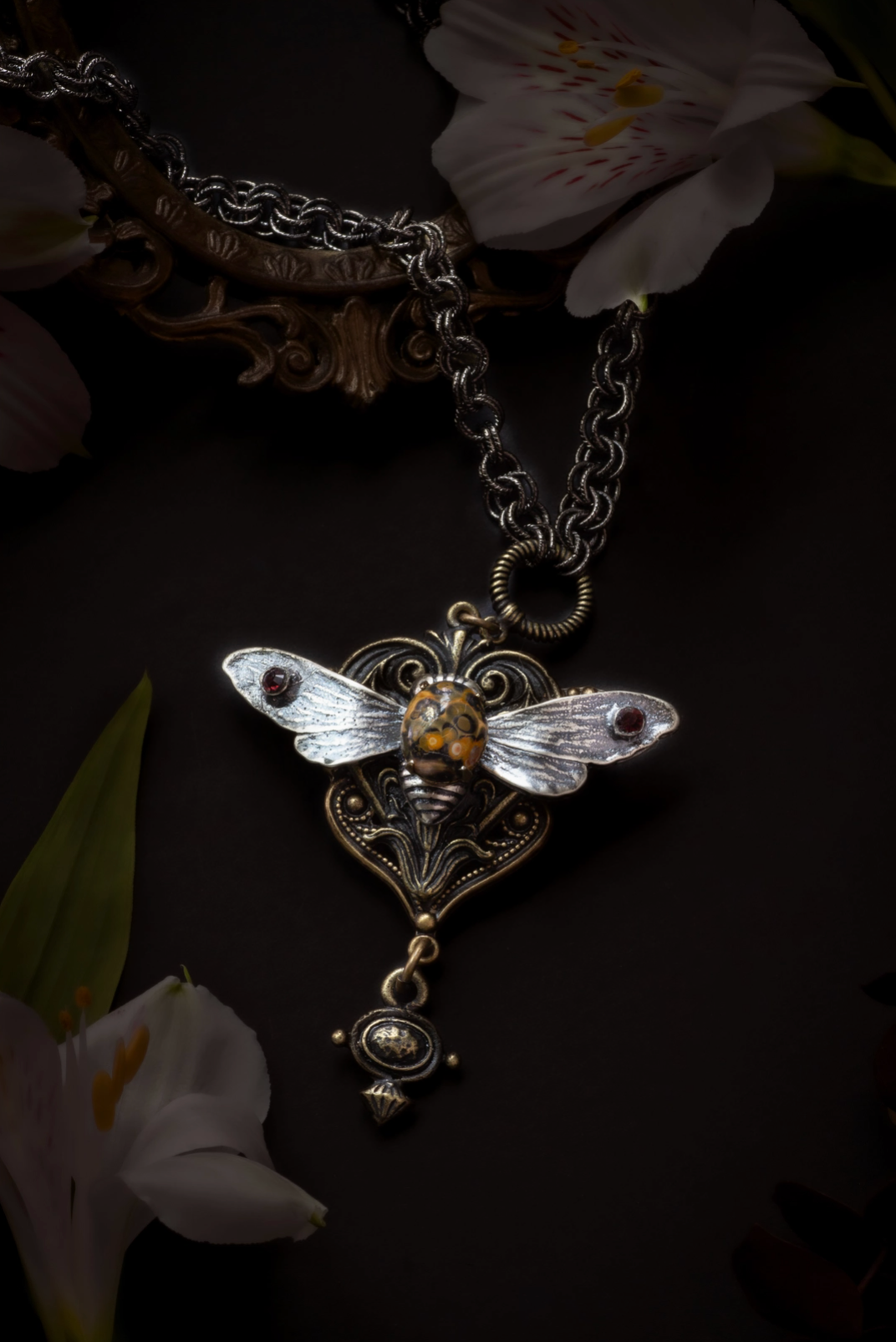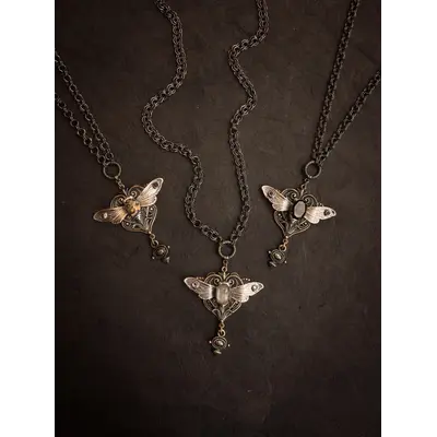 An ancient devotee of cycles, cicada sings with the endless rhythm of dissolving and re-forming. From sapdreaming nymphs nourished by buried roots to chitin creatures bursting forth, she cants her song through the depths of time. On this planchette-style amulet, cicada is crowned with a luminous gemstone cabochon and flanked by twin rhinestones, Wear it as an invocation of cycles both within and without and a prayer to the mysteries lodged between what has ended and what is yet to begin.