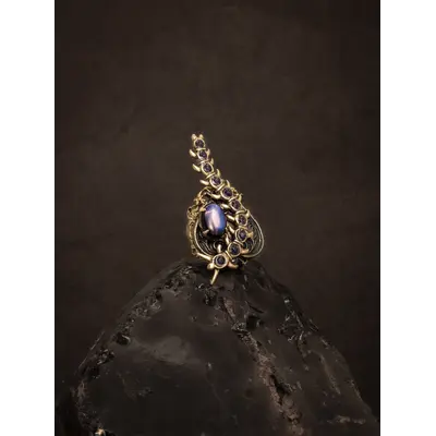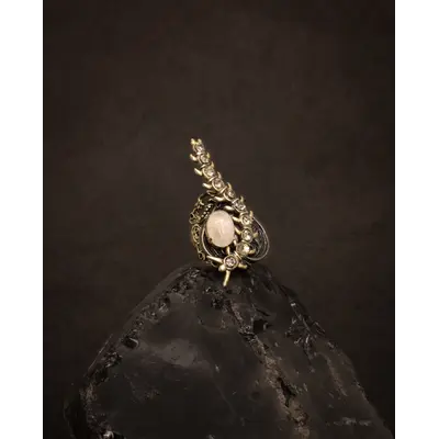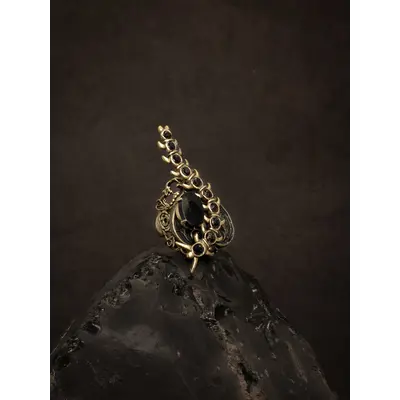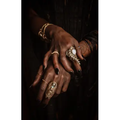 This asymmetrical gemstone ring invites you to awaken your own wild edge—the hidden, primal instincts that sense danger before it surfaces - especially those buried deep in the subconscious. A talisman for those ready to walk outlawed inner terrain, this studded feral fingerpiece is worn by the untamable self. This high fashion rebellion is made of gold plated bronze, a gemstone and vintage European rhinestones.