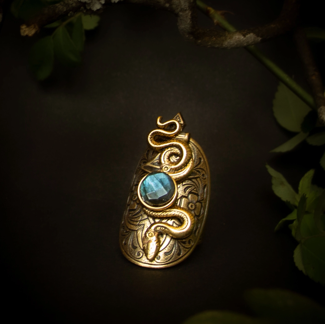 Feel the power slither up within you as a serpent holding a faceted labradorite in its coils rises on your finger.