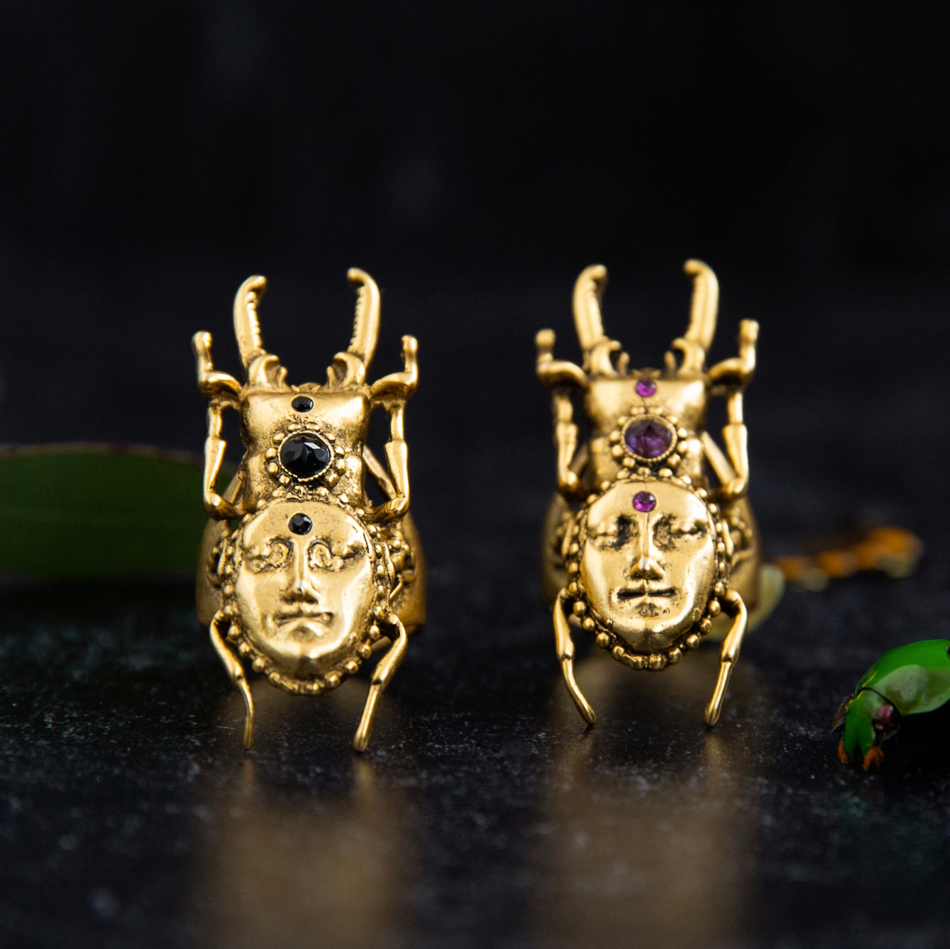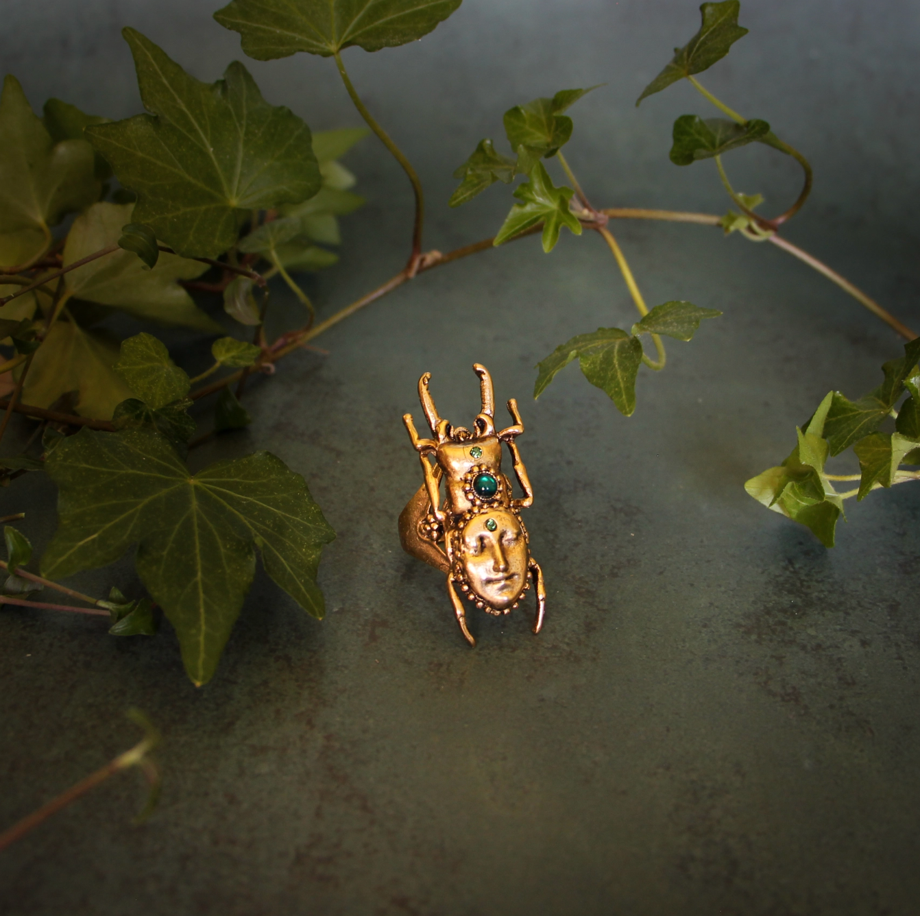 This ring features a realistic stag beetle with a human face, wearing a gemstone crown, inside the thorax. Made for those with a magical imagination who can appreciate the mystery of the moment, and know that sometimes things are not what they seem.
