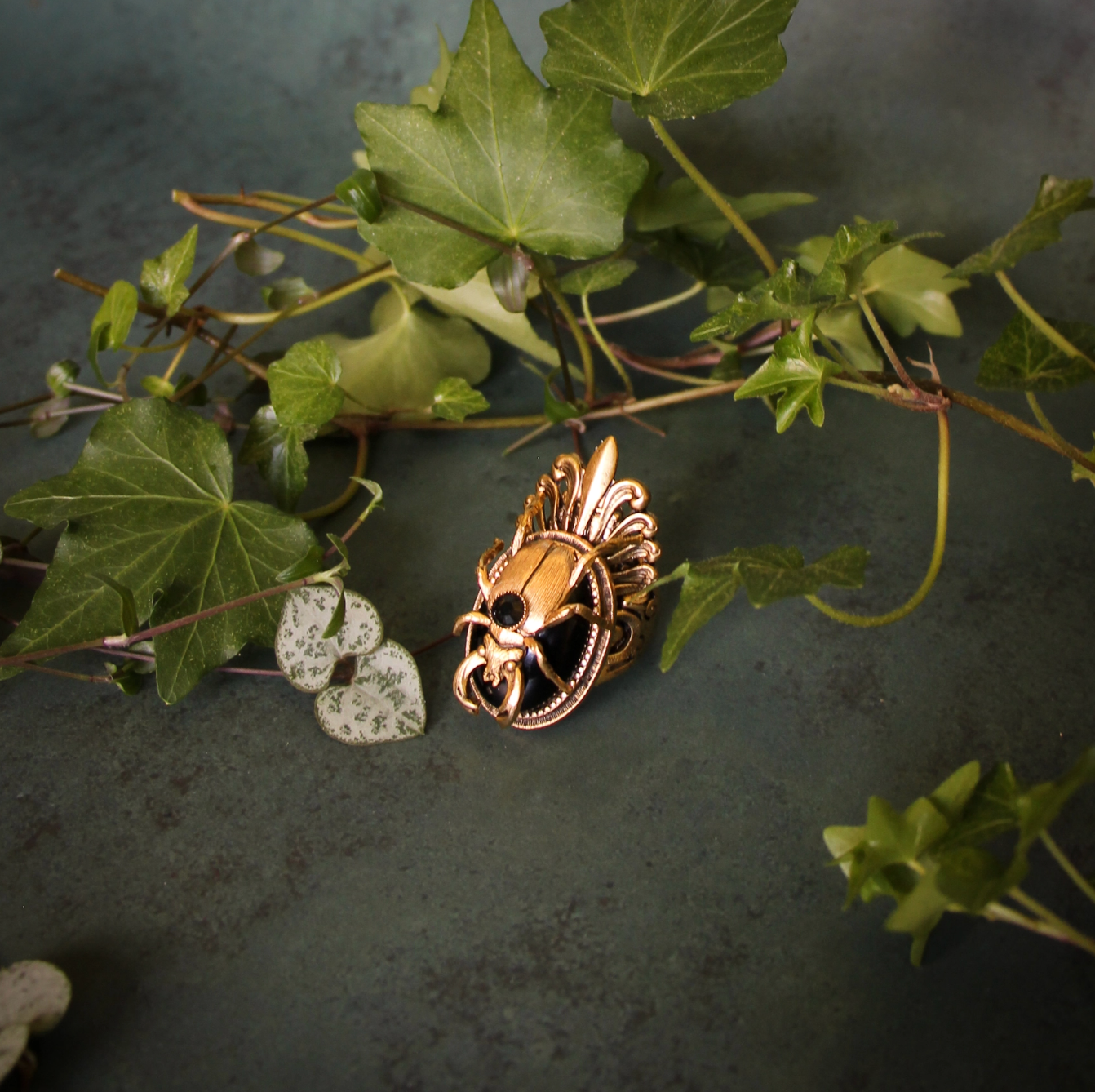 Golden stag beetle adorned with a rhinestone sits atop a large gemstone on this substantial and playful filigree cocktail ring.