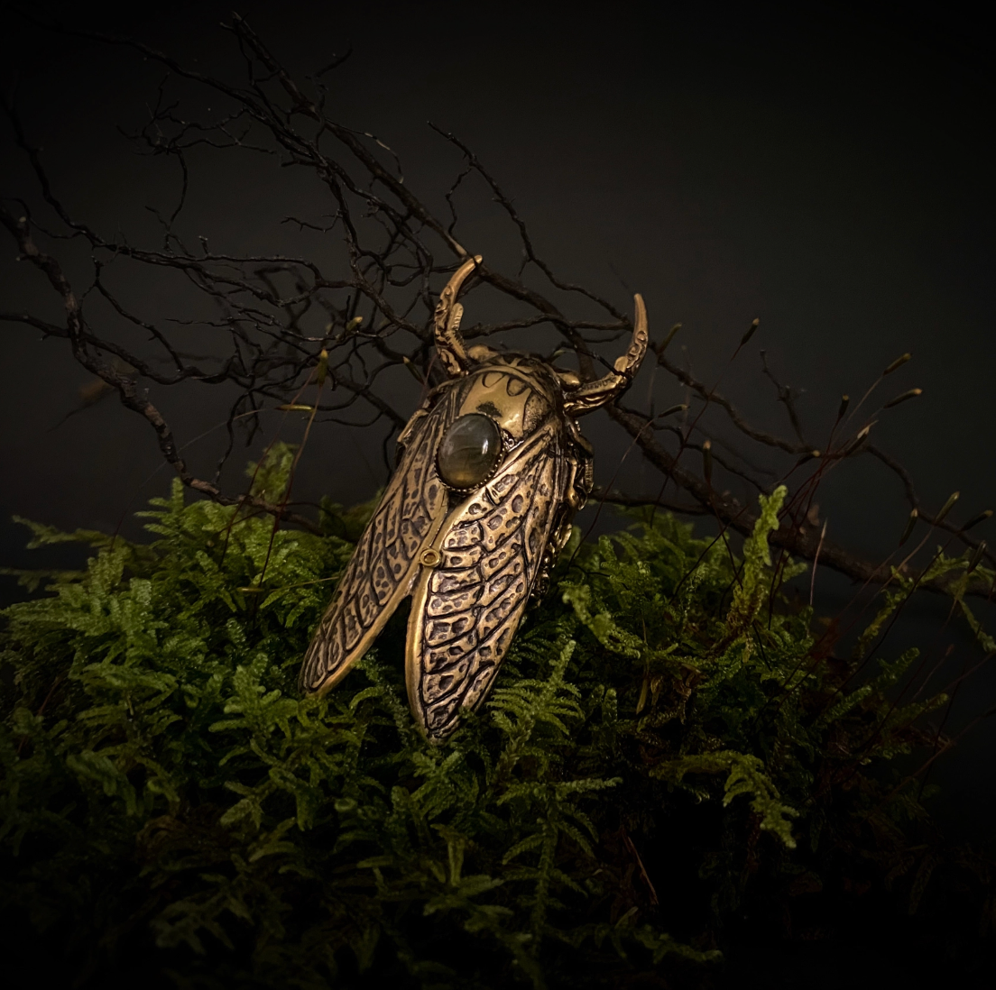 A cicada is crowned by a crescent moon and wears the jewel of intuition - labradorite.
