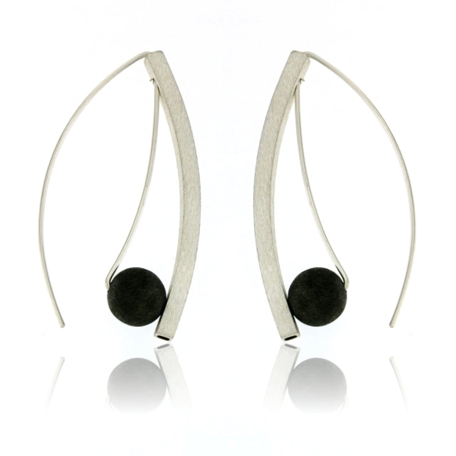 Introducing the RG 332 earrings from the Mysterium Collection, where minimalist design meets captivating contrast. These exquisite 2" drop earrings feature a graceful, curved silver bar with a modern matte finish, exuding understated elegance. Suspended with intriguing balance is a single, rich oxidized black ball, creating a striking visual interplay between light and dark, sleekness and texture. Perfect for those who appreciate contemporary artistry and seek a versatile accessory that makes a subtle yet powerful statement.