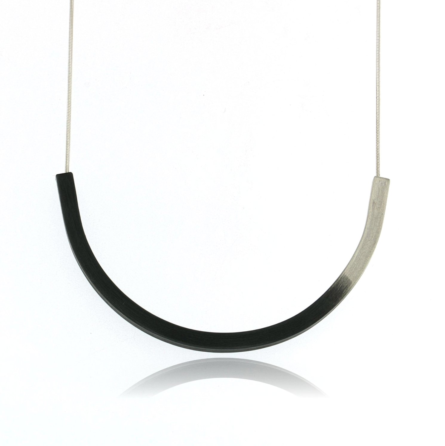 Make a distinct impression with the MT 660OX necklace, a piece of wearable art from the Mysterium Collection. Suspended on a chic 22" silver chain, the 2 3/8" wide arch pendant showcases a mesmerizing silver ombre that flows into a deep, black oxidized finish. This unique gradient creates an edgy yet sophisticated aesthetic, making it an ideal accessory for adding a touch of avant-garde style to any outfit. It's more than jewelry; it's a statement of contemporary class.