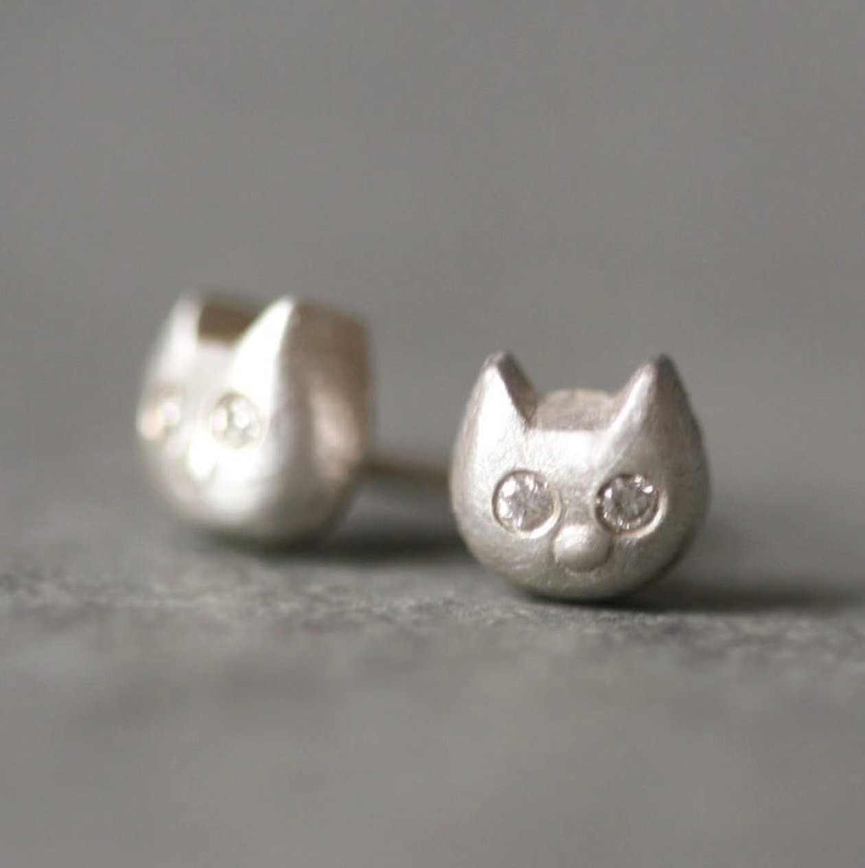 Tiny cat stud earrings with two diamond eyes in sterling silver. Approx. 3/16" wide.
