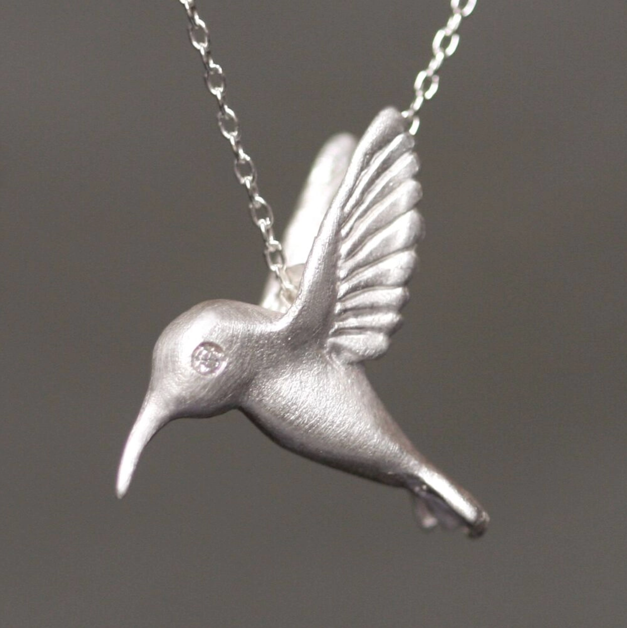 Hummingbird pendant necklace in sterling silver with diamonds. Hummingbird pendant necklace on a fine chain. All in sterling silver with two diamond eyes. The hummingbird is approx. 3/4" by 3/4". Finish is brushed satin.