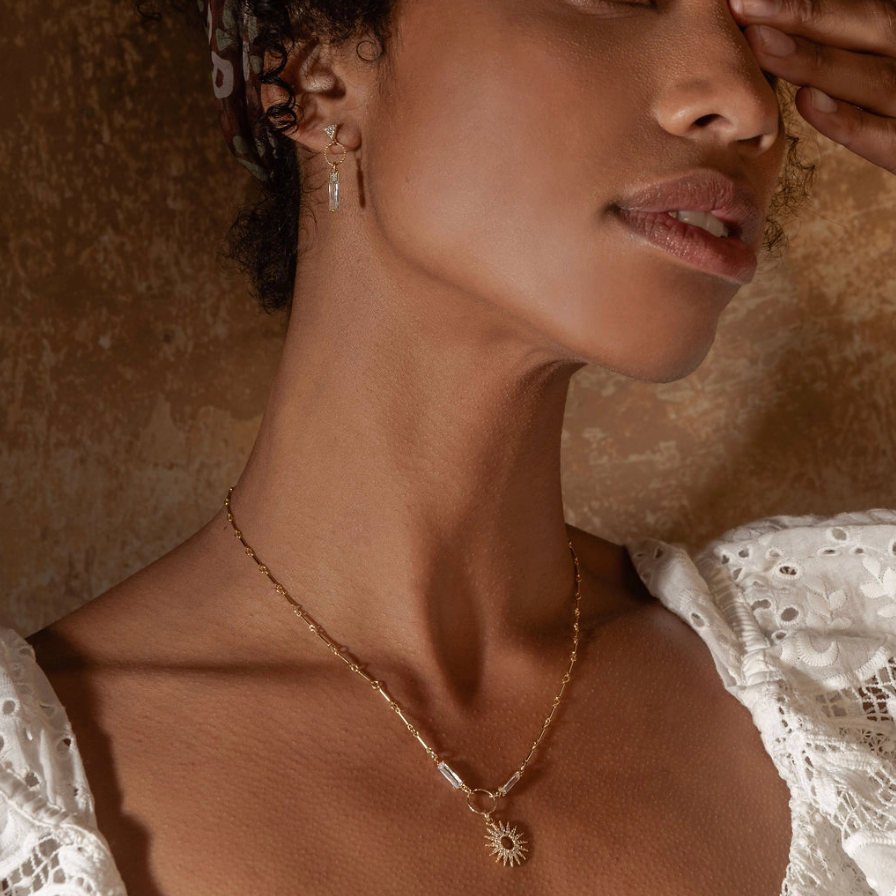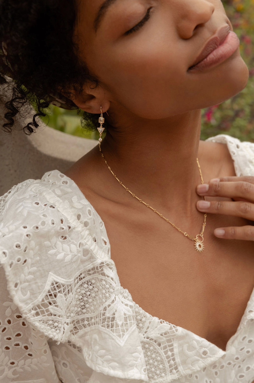 This beautiful necklace features 2 baguette cut crystals set in as part of the chain. Another sparkly and elegant cubic star hangs below to add celestial bling to this striking and unusual piece.