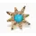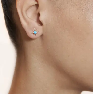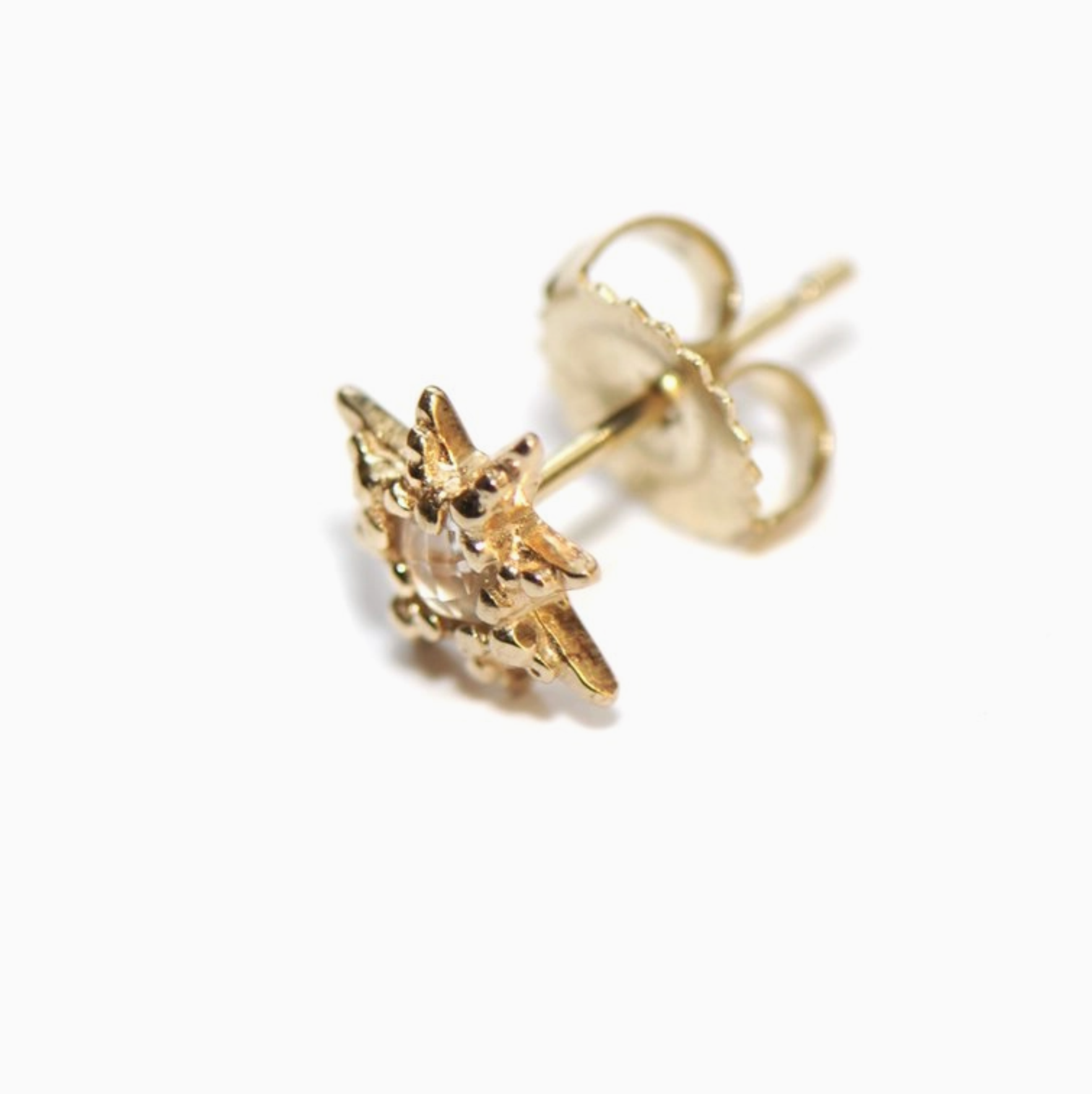 A vibrant gemstone is encrusted in a unique micro golden setting inspired by a starburst's silhouette.