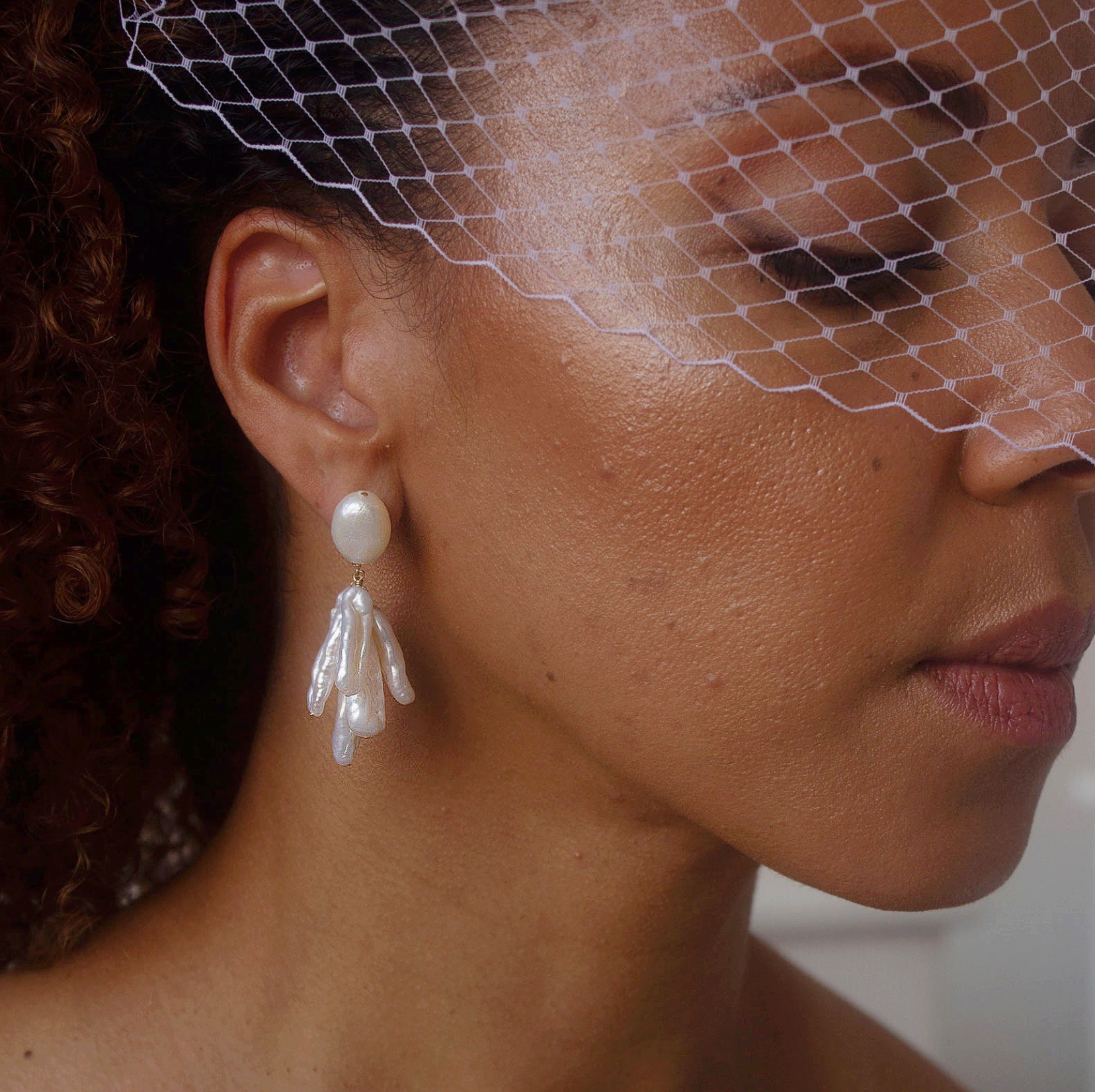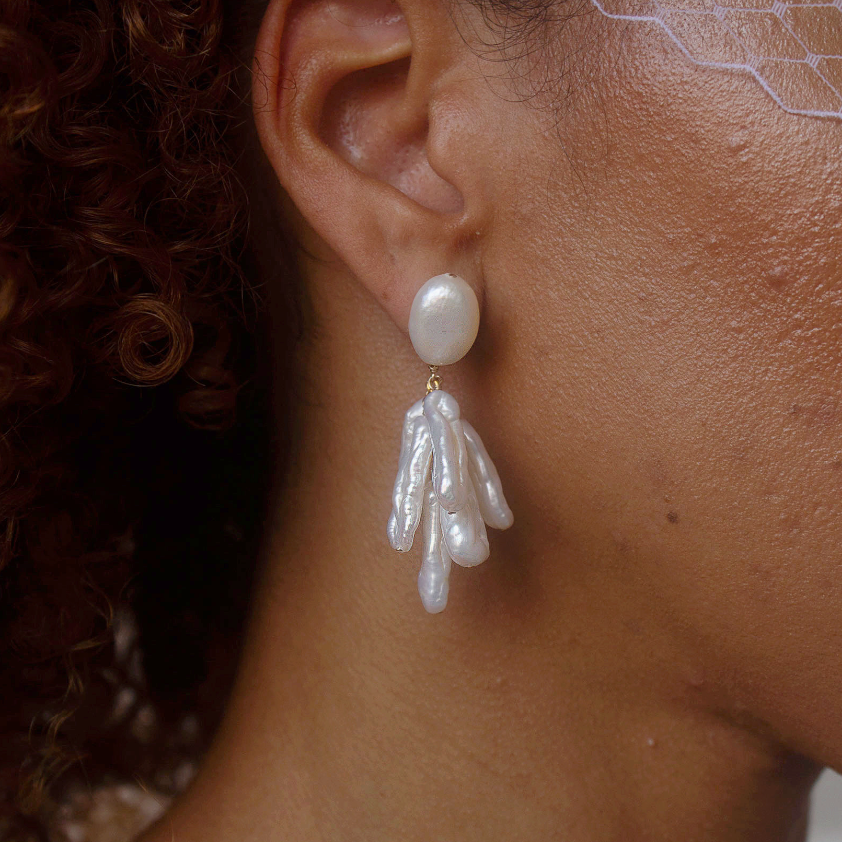 Inspired by swans, these earrings, composed of genuine freshwater pearls, gracefully sway mimicking the look of feathers. Lightweight and easy to wear, they are suspended from a baroque pearl stud.