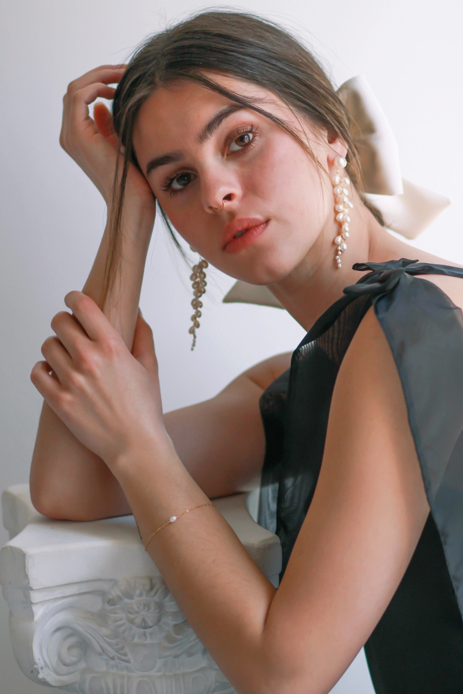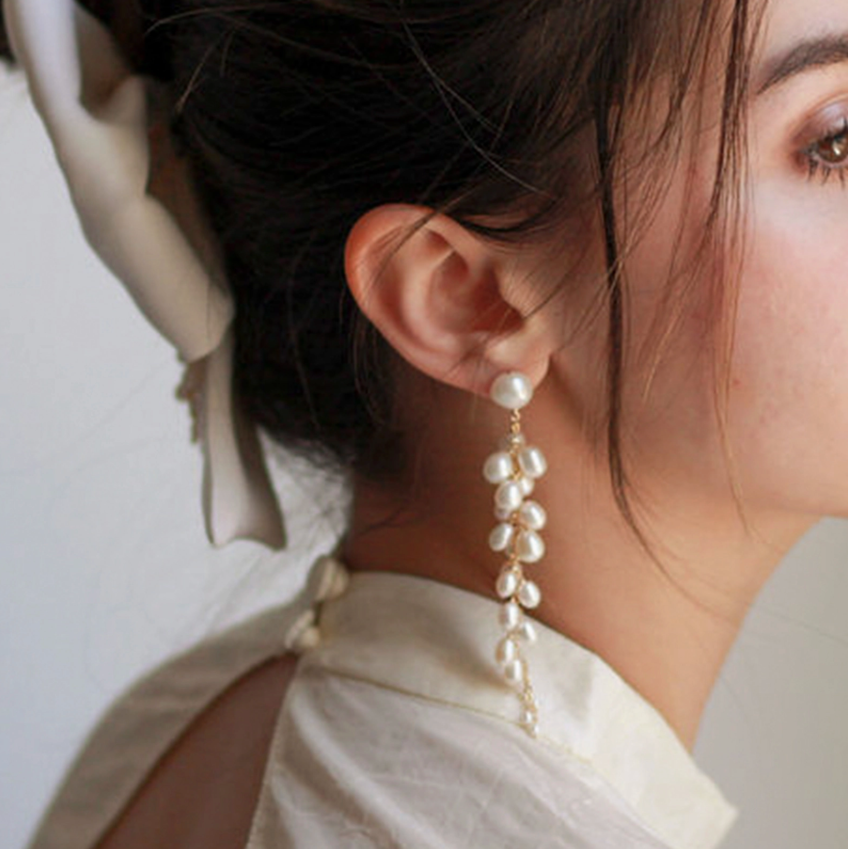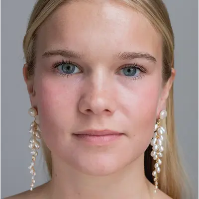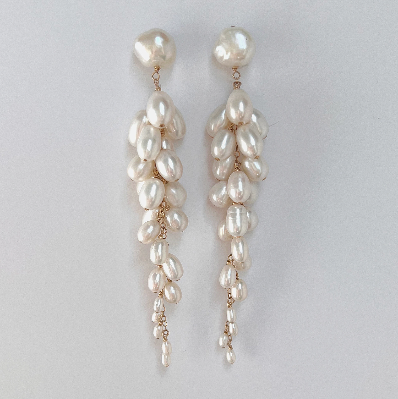 A dreamy take on the classic pearl earring. Completely hand-fabricated, The Sereine Earrings feature clustered tendrils of freshwater pearls in off white and natural white dangling from baroque pearl posts. They are lightweight and gracefully sway in movement.
