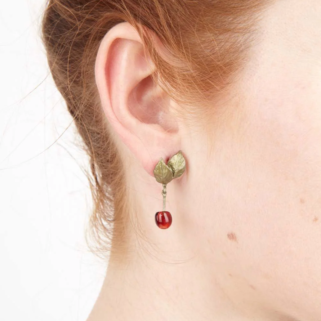 Materials: The Morello Cherry earrings are cast in bronze and accented with hand formed red glass beads.