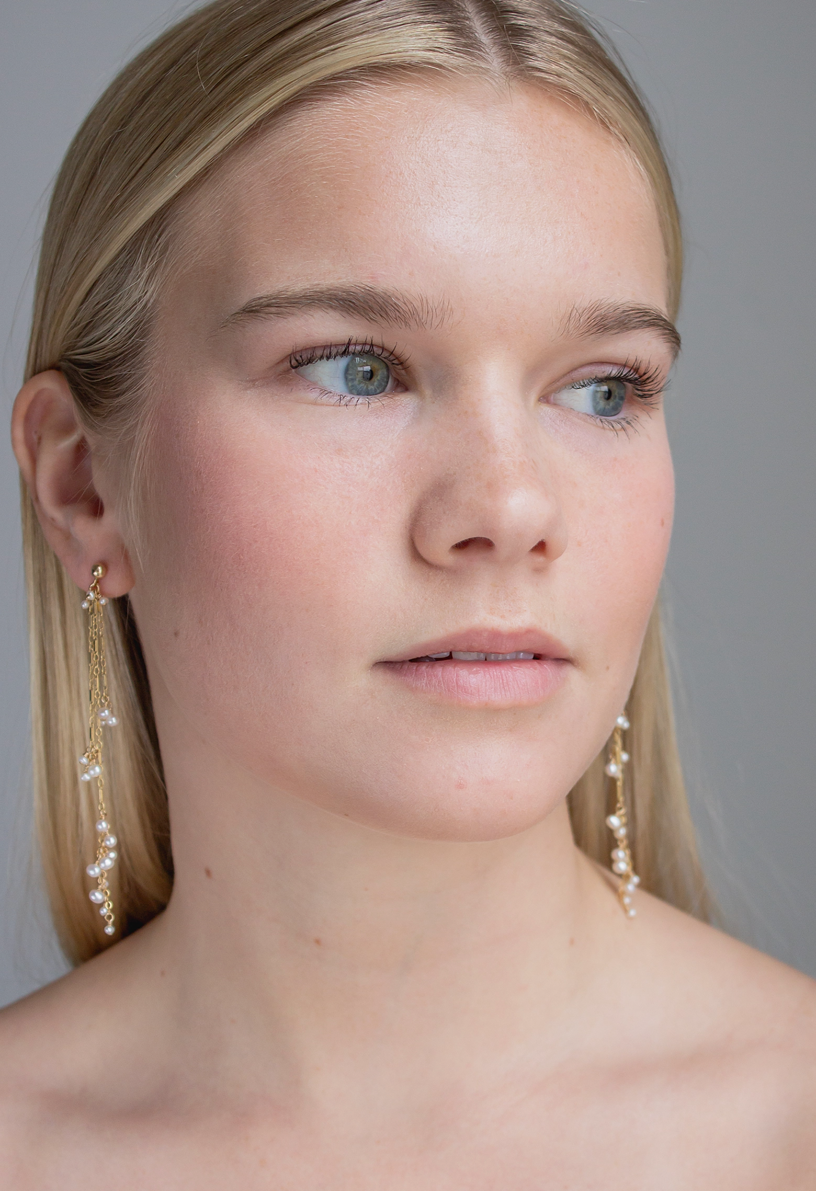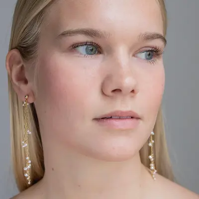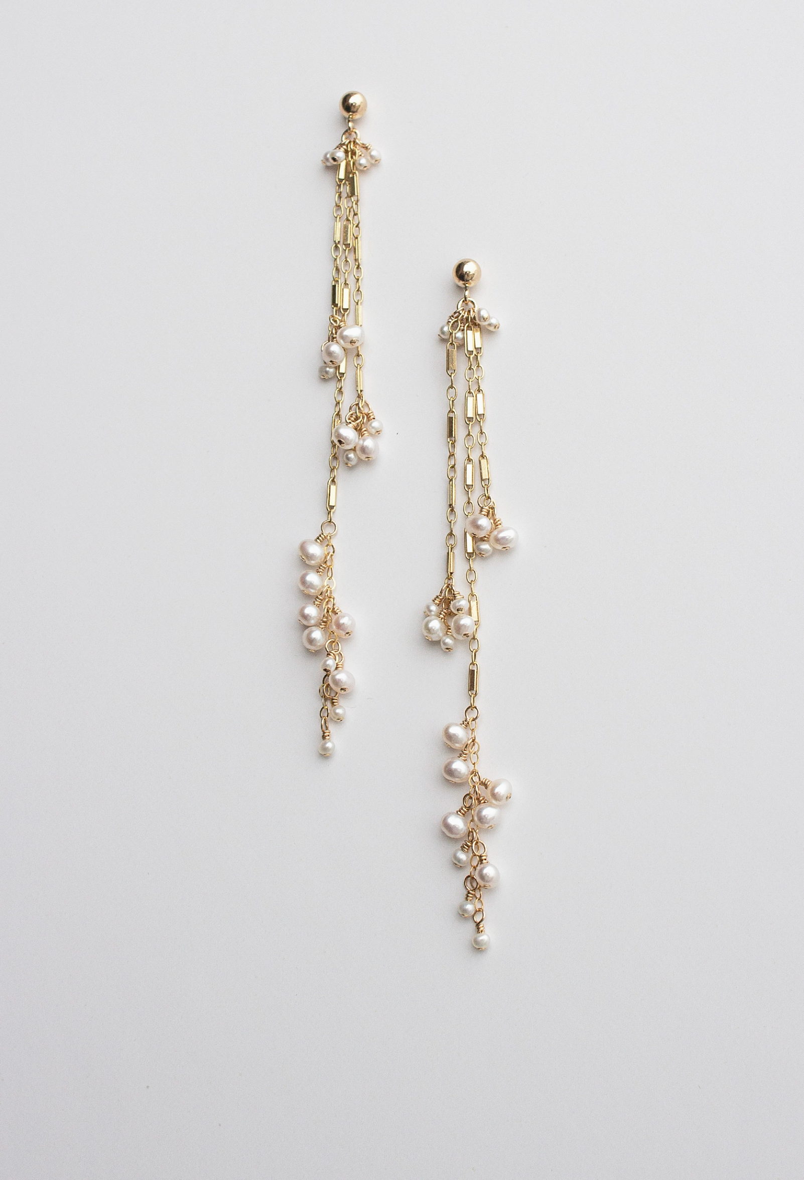 A triple strand earring with sporadic signature clustering in freshwater pearls. Dainty and long, this wispy style earring features posts. Lightweight and comfortable to wear.