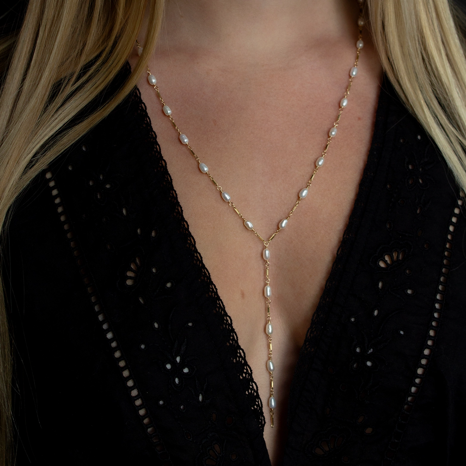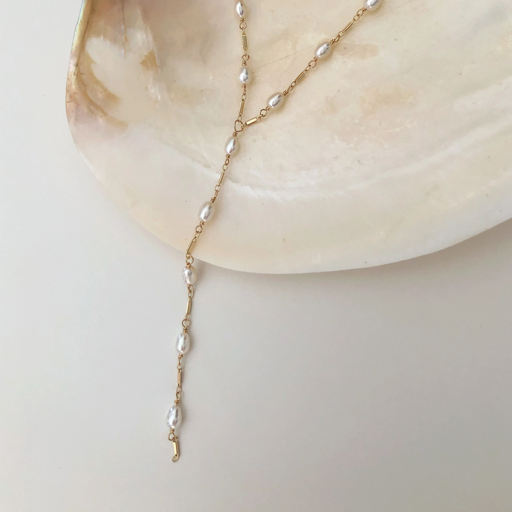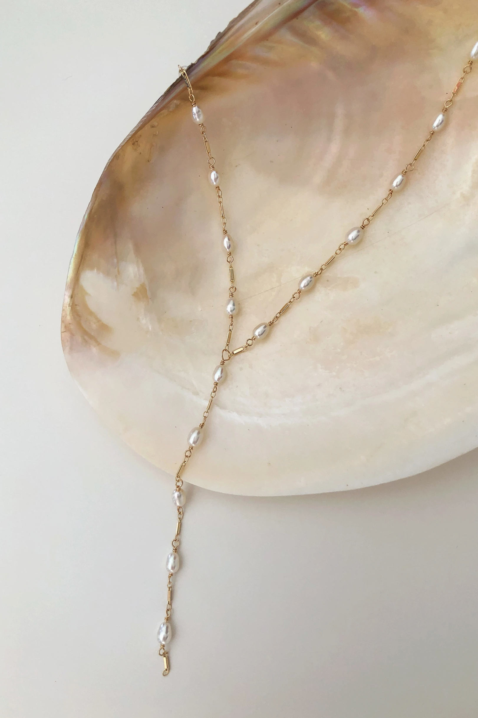 The Dripping Freshwater Pearl Necklace is composed of 4mm freshwater rice pearls separated by 14k gold filled or sterling silver dainty bars. A 3 1/2" matching drop elegantly flows into mid-air. Due to the nature of handmade, each one is slightly different and unique to you.