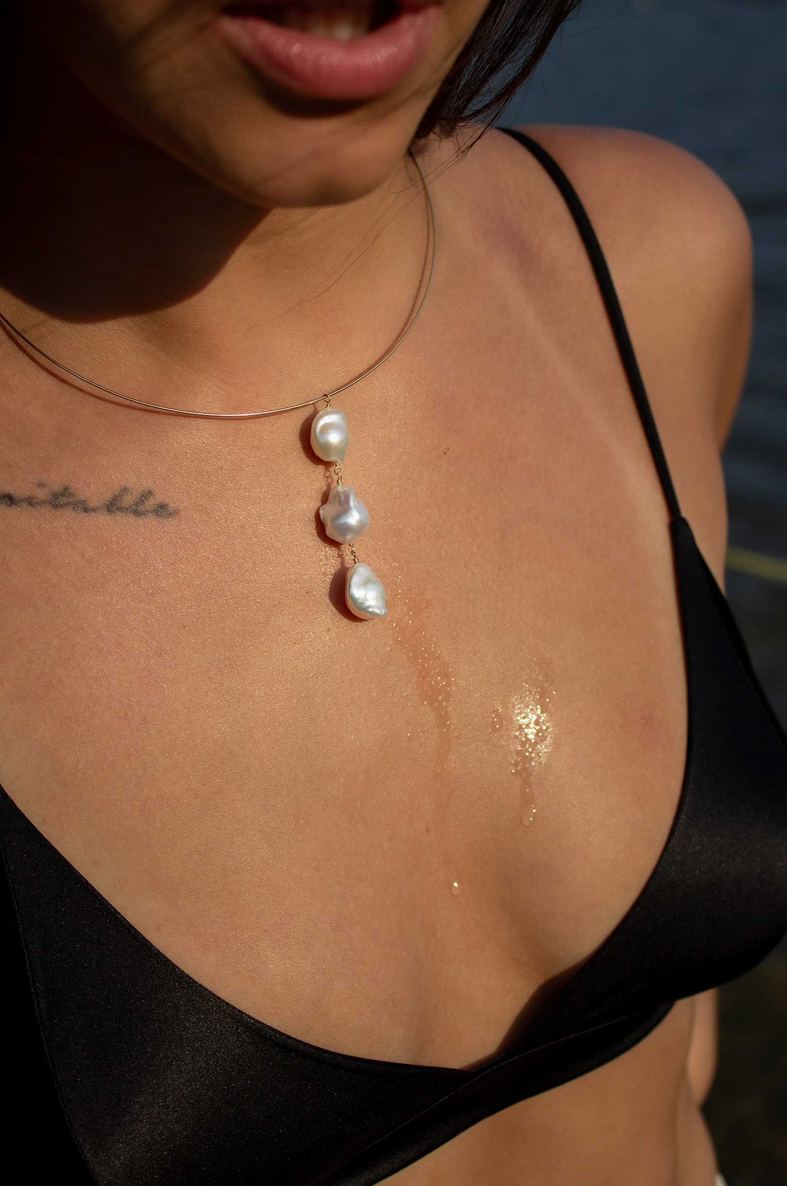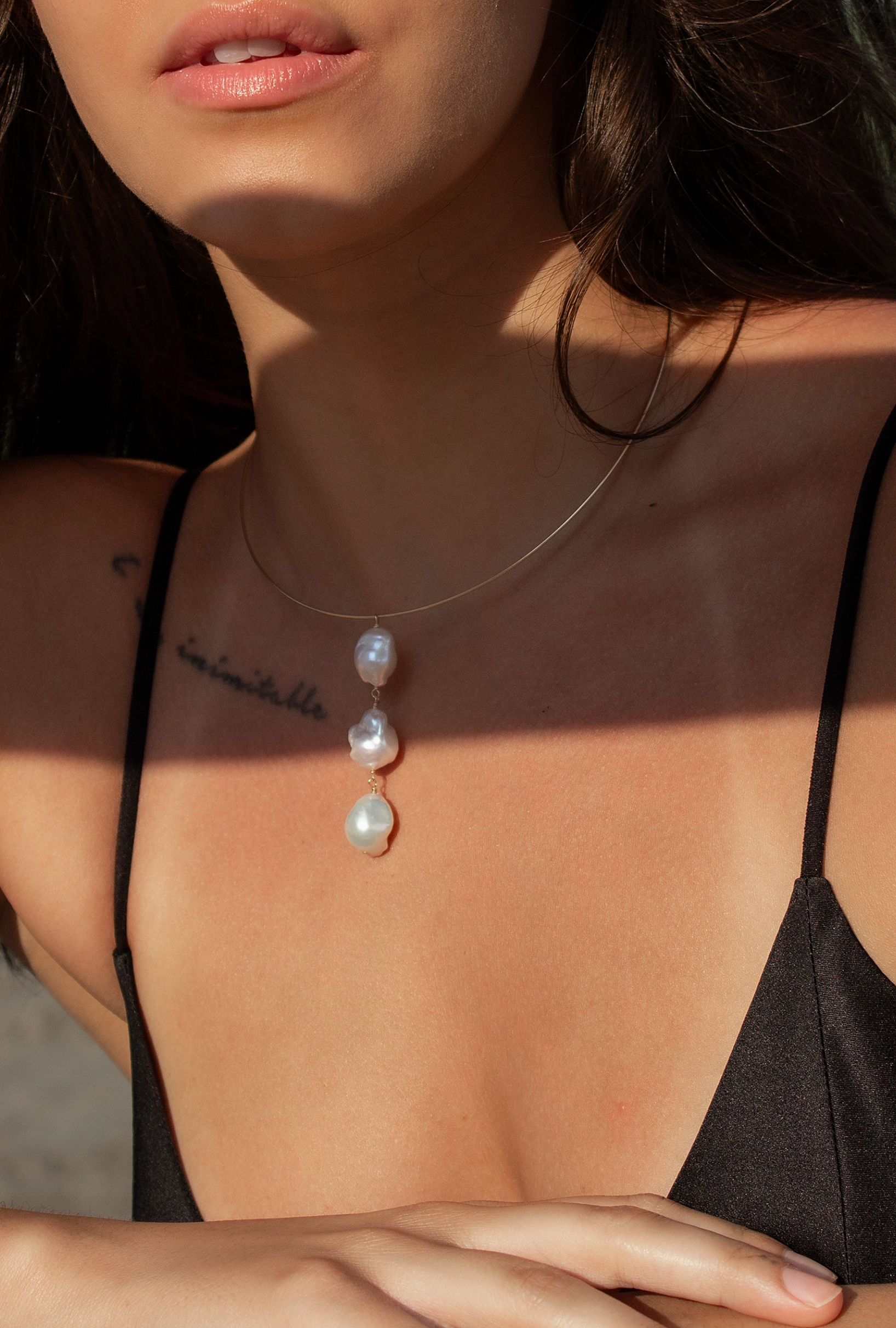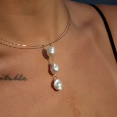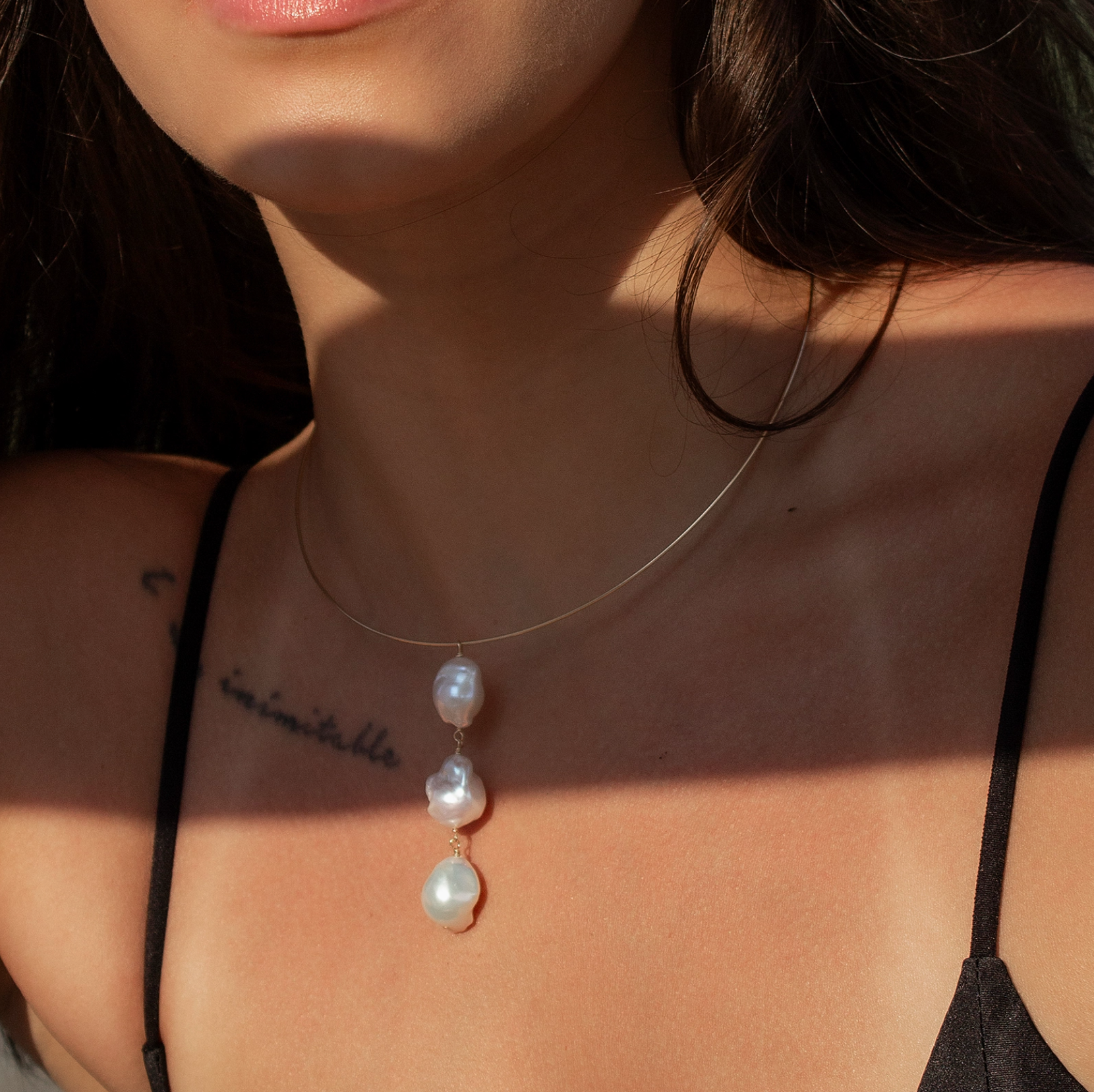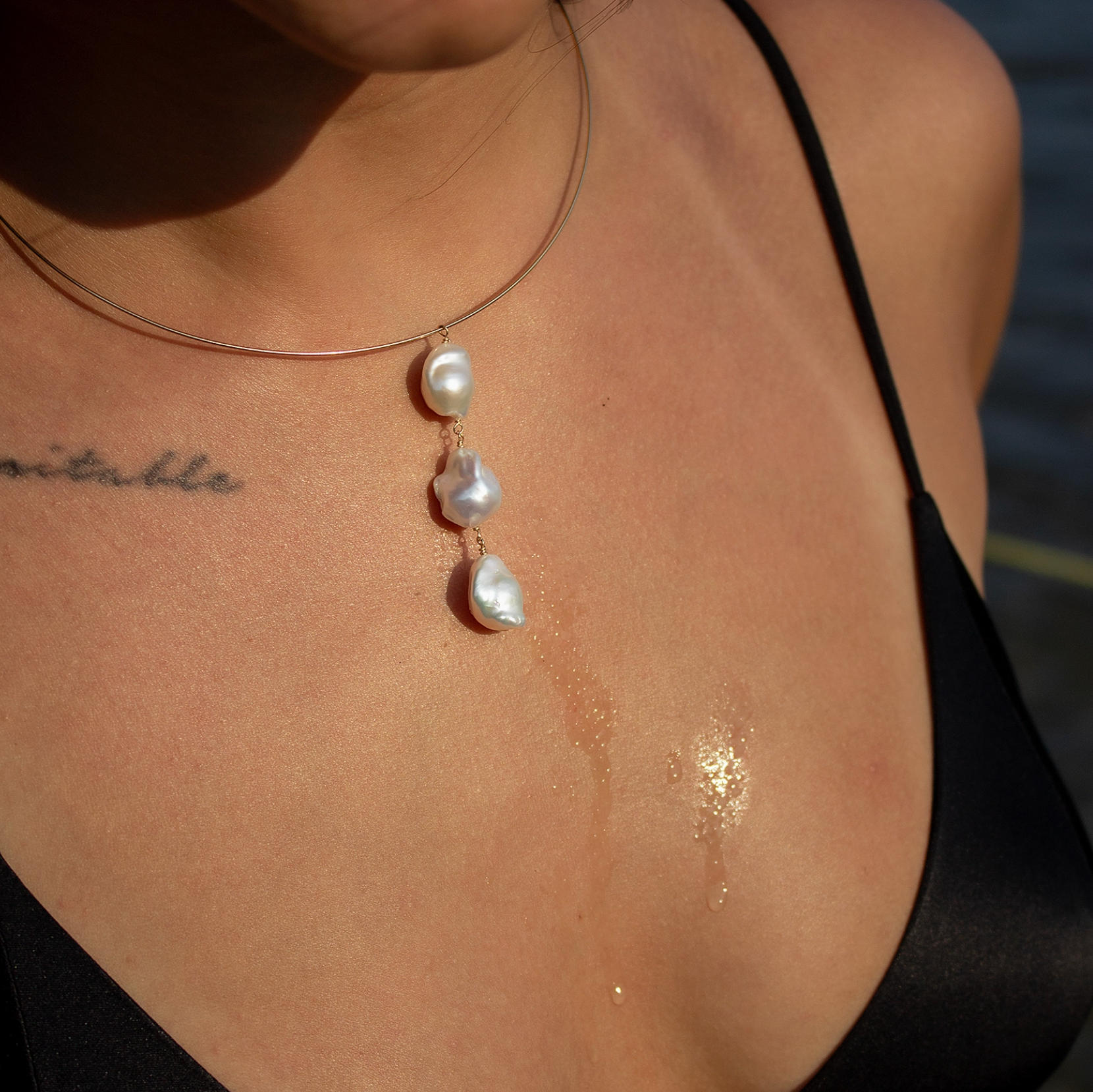 A minimalist neck ring featuring a trio of baroque pearls. A simple way to make a statement.