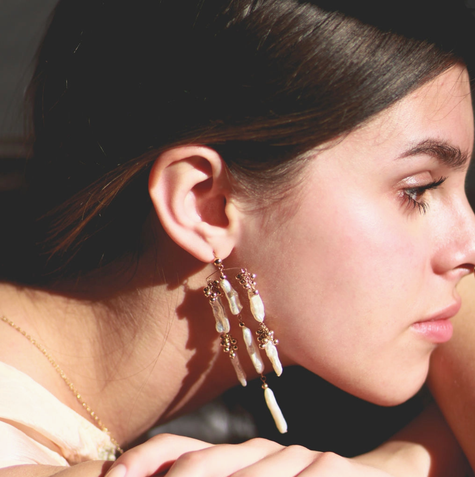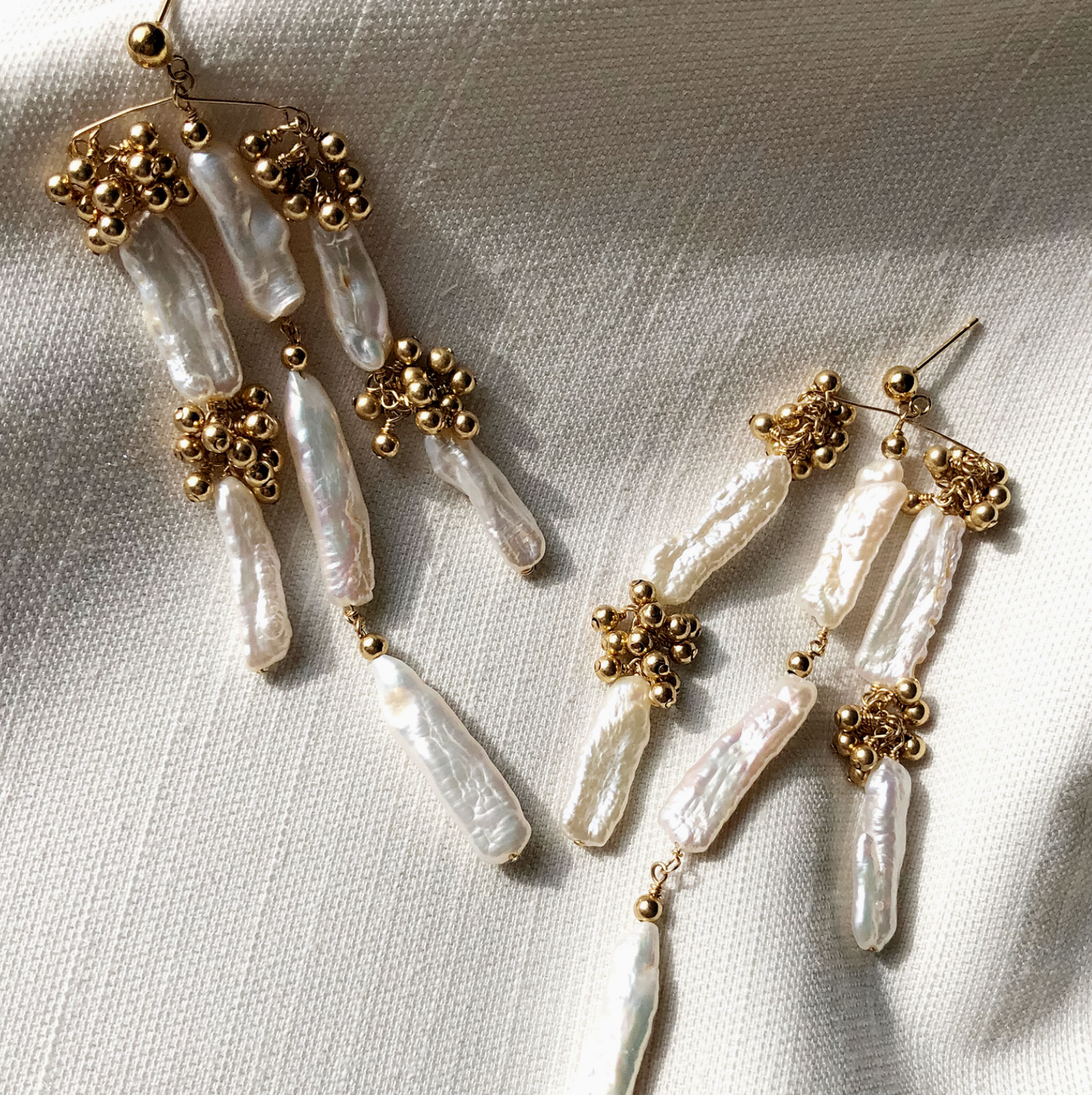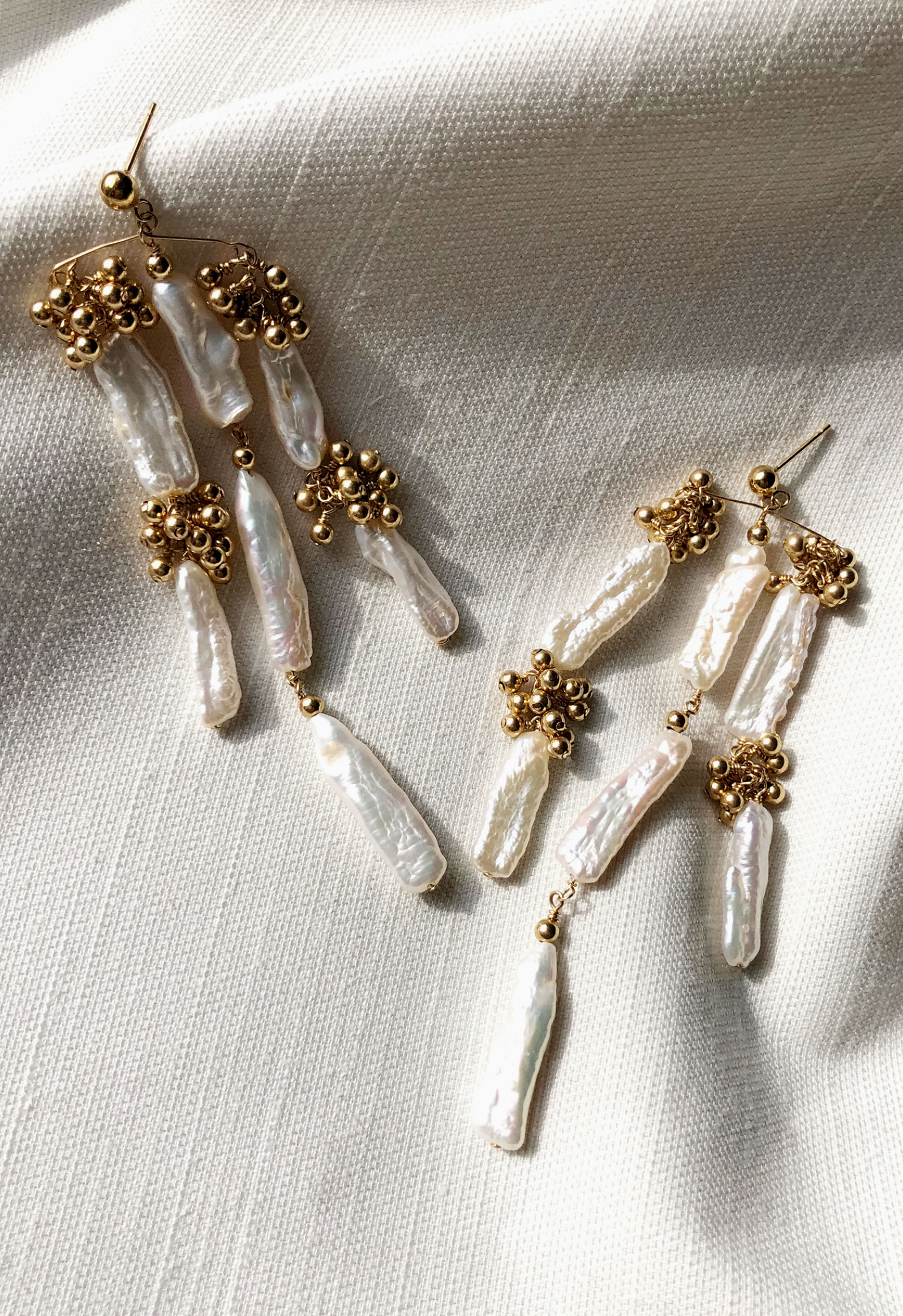 Completely handcrafted in our New York studio, the Linear Eyelet Chandelier Earrings feature genuine biwa pearls and signature "gold dust" detailing. Lightweight and easy to wear.