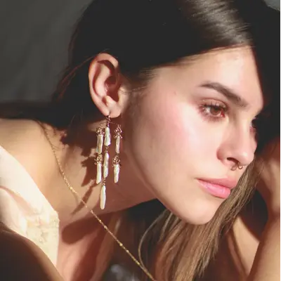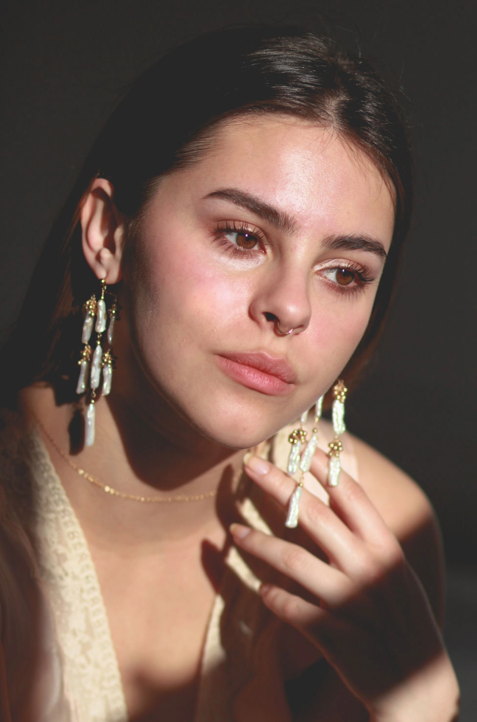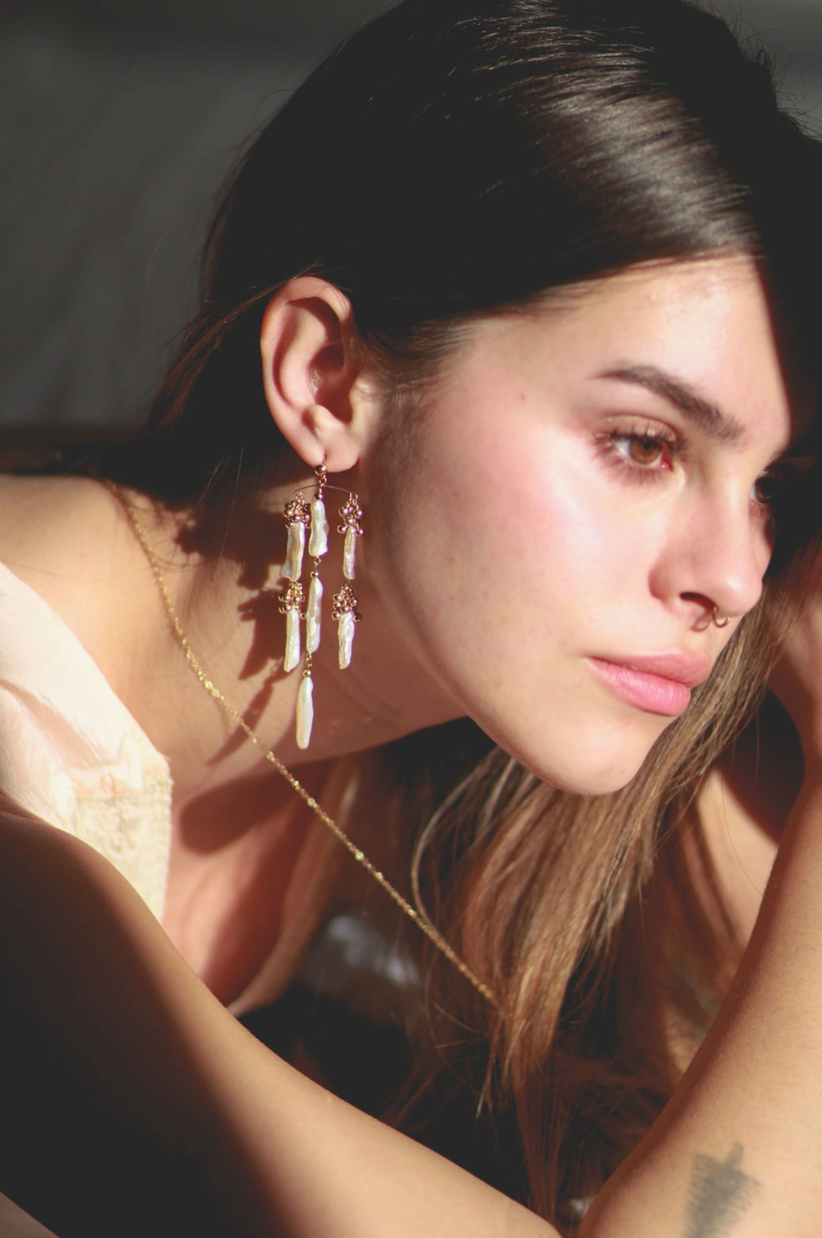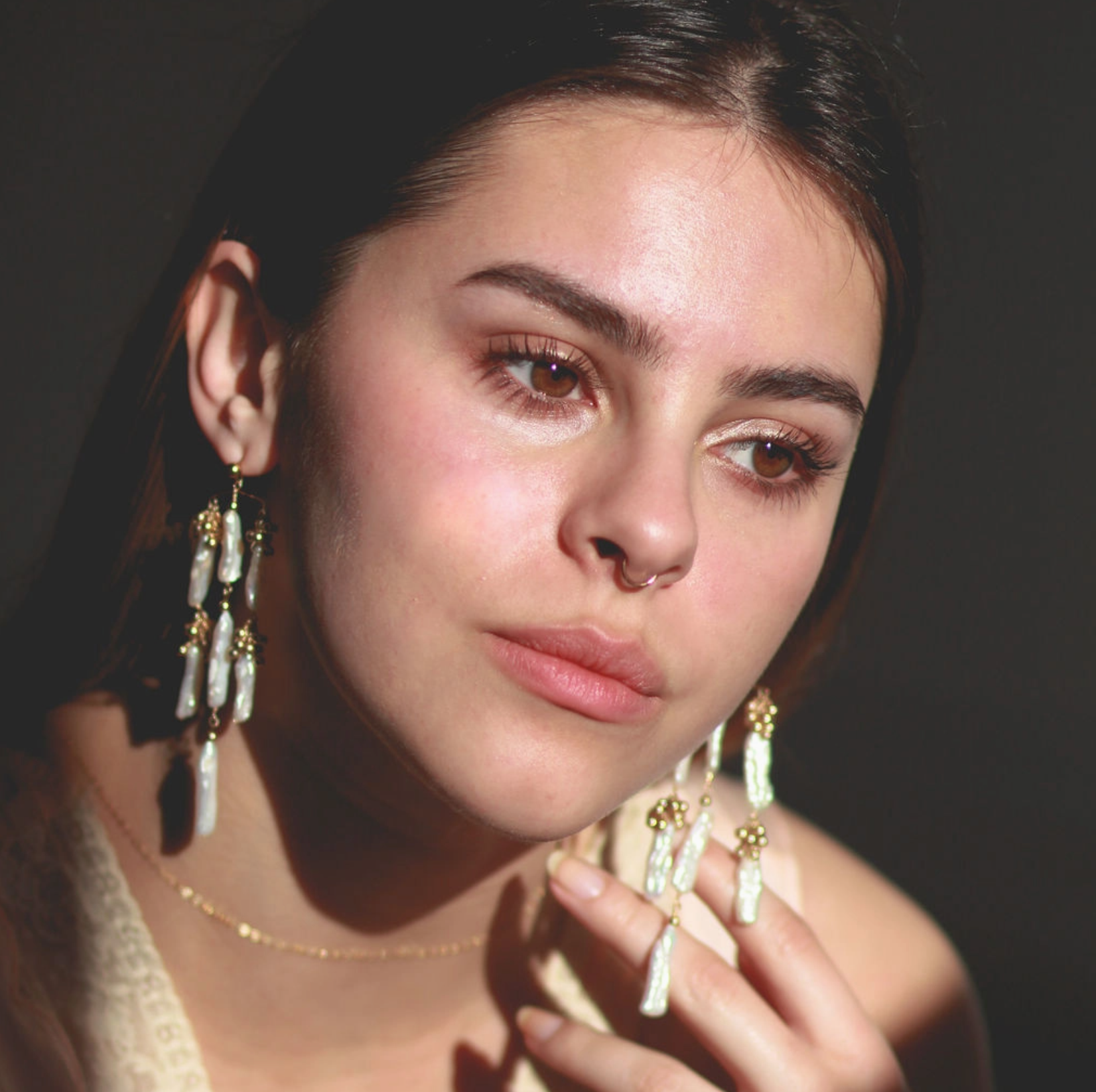Completely handcrafted in our New York studio, the Linear Eyelet Chandelier Earrings feature genuine biwa pearls and signature "gold dust" detailing. Lightweight and easy to wear.