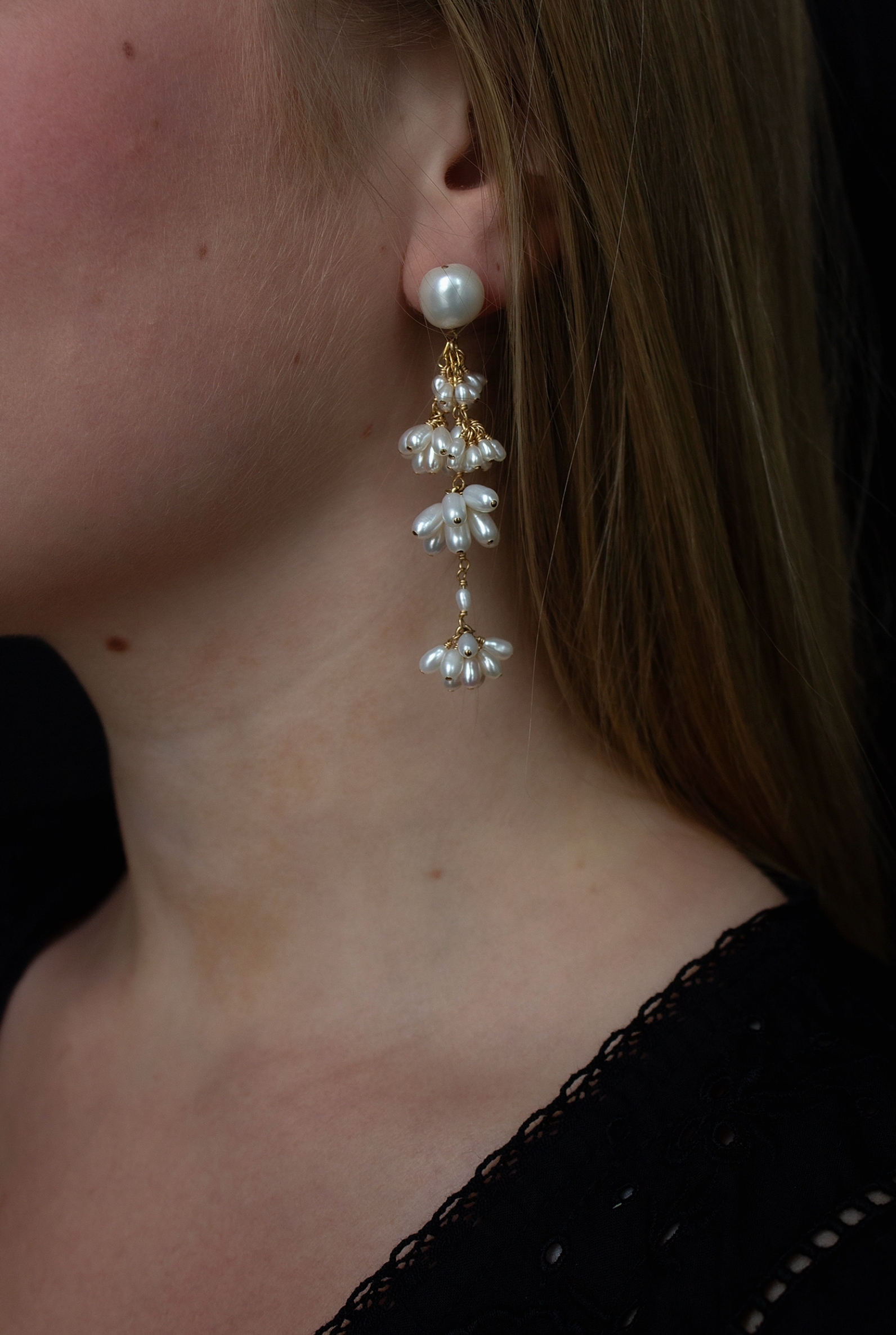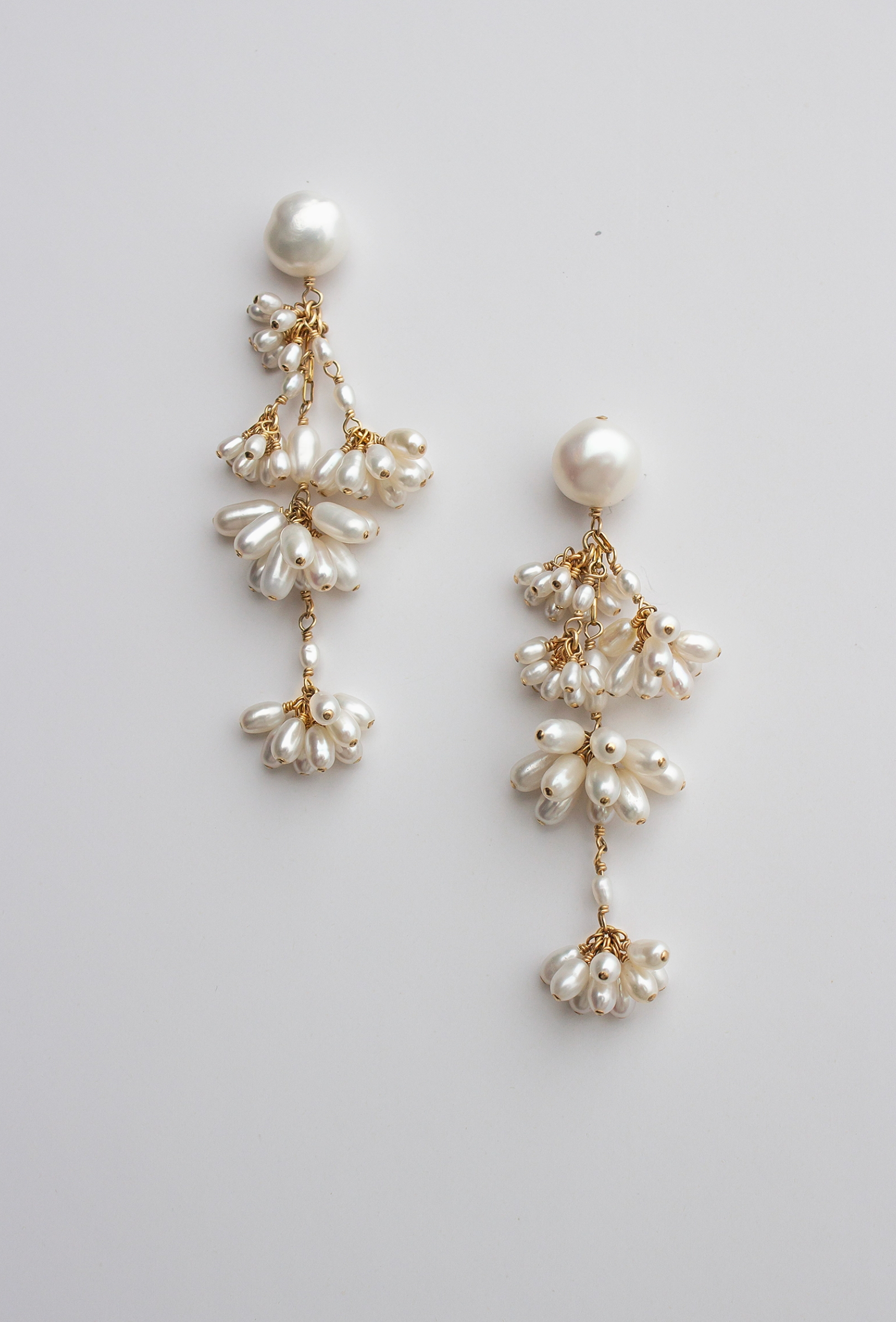 A daintier version of our cascading statement earrings, composed of our signature freshwater pearl fleurettes. Tiers of pearls cascade from a baroque pearl stud.