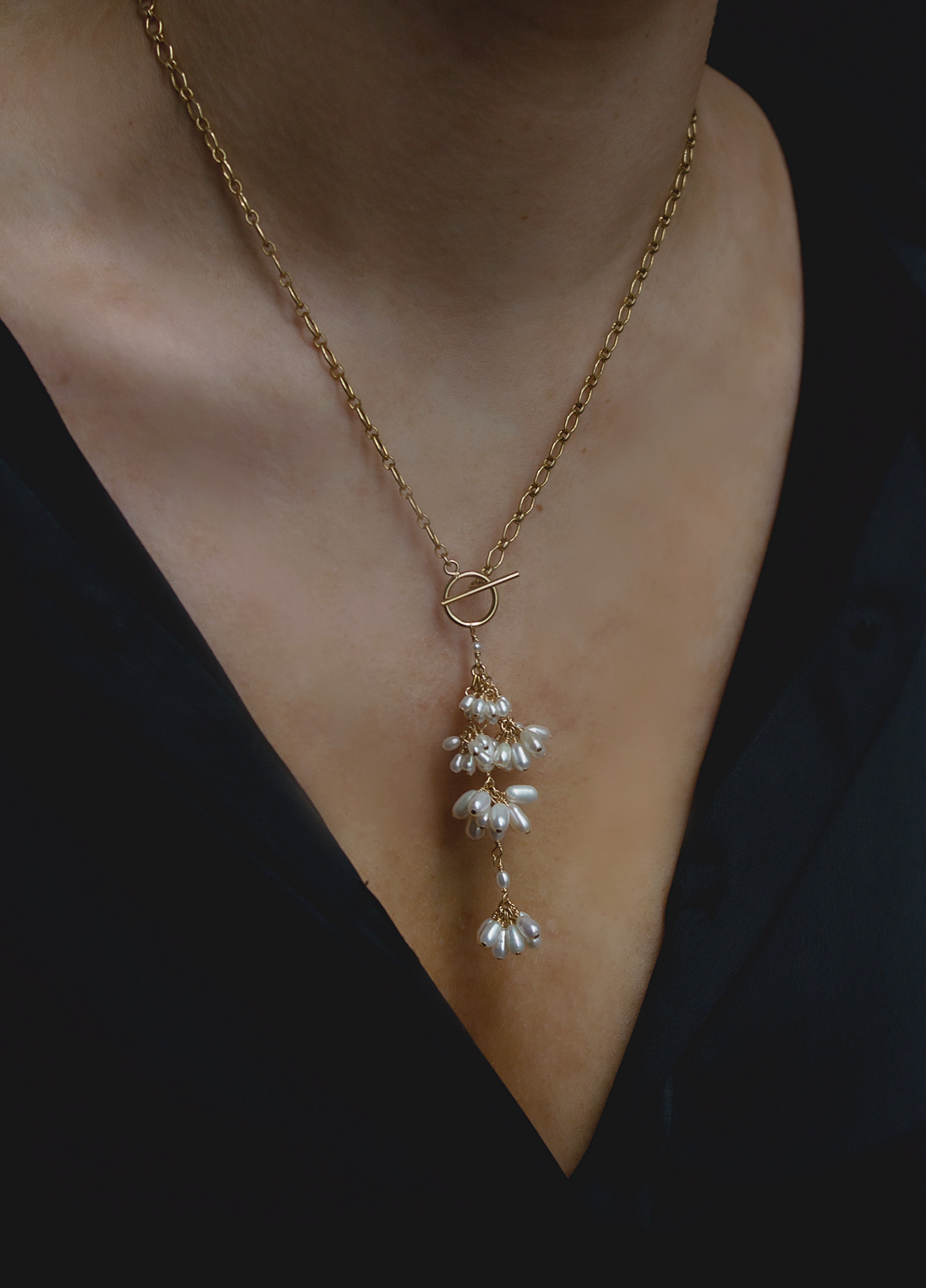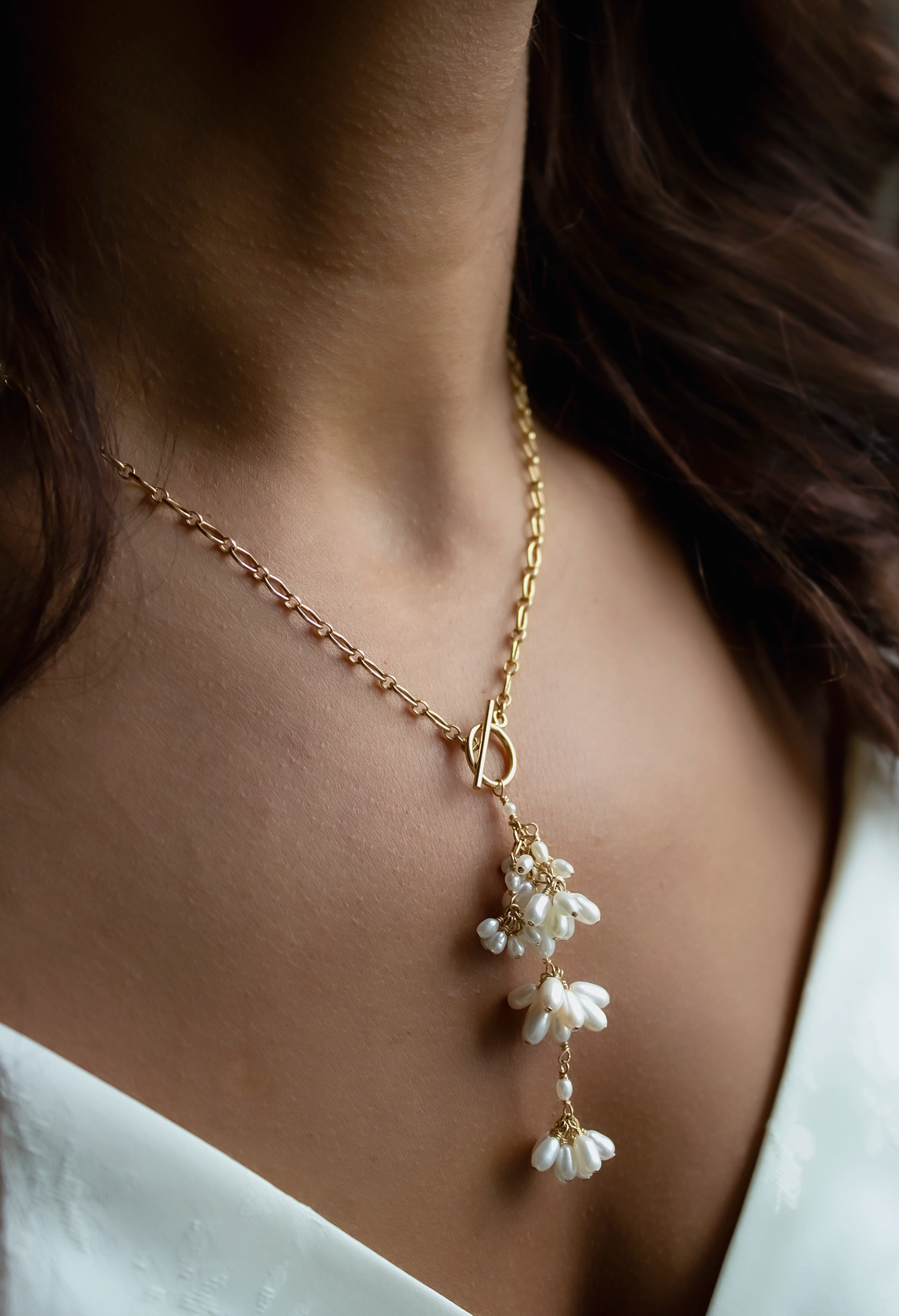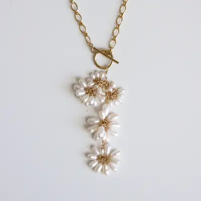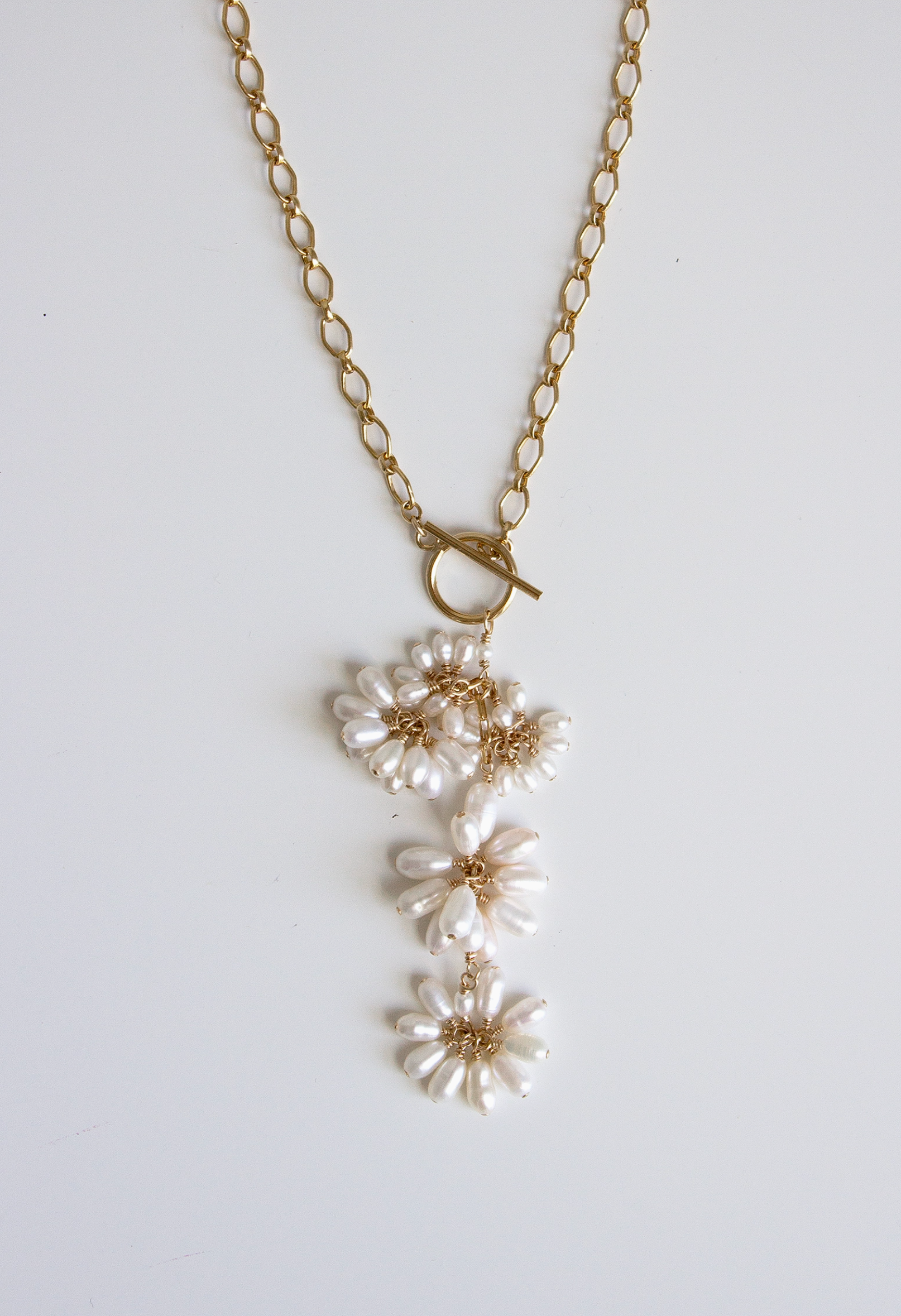 Inspired by nature, The Jardin Toggle Necklace is features a statement chain and toggle with cascading signature pearl fleurettes. Due to the nature of natural pearls each pair is slightly different and unique to you.