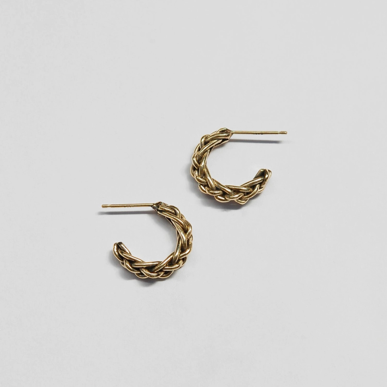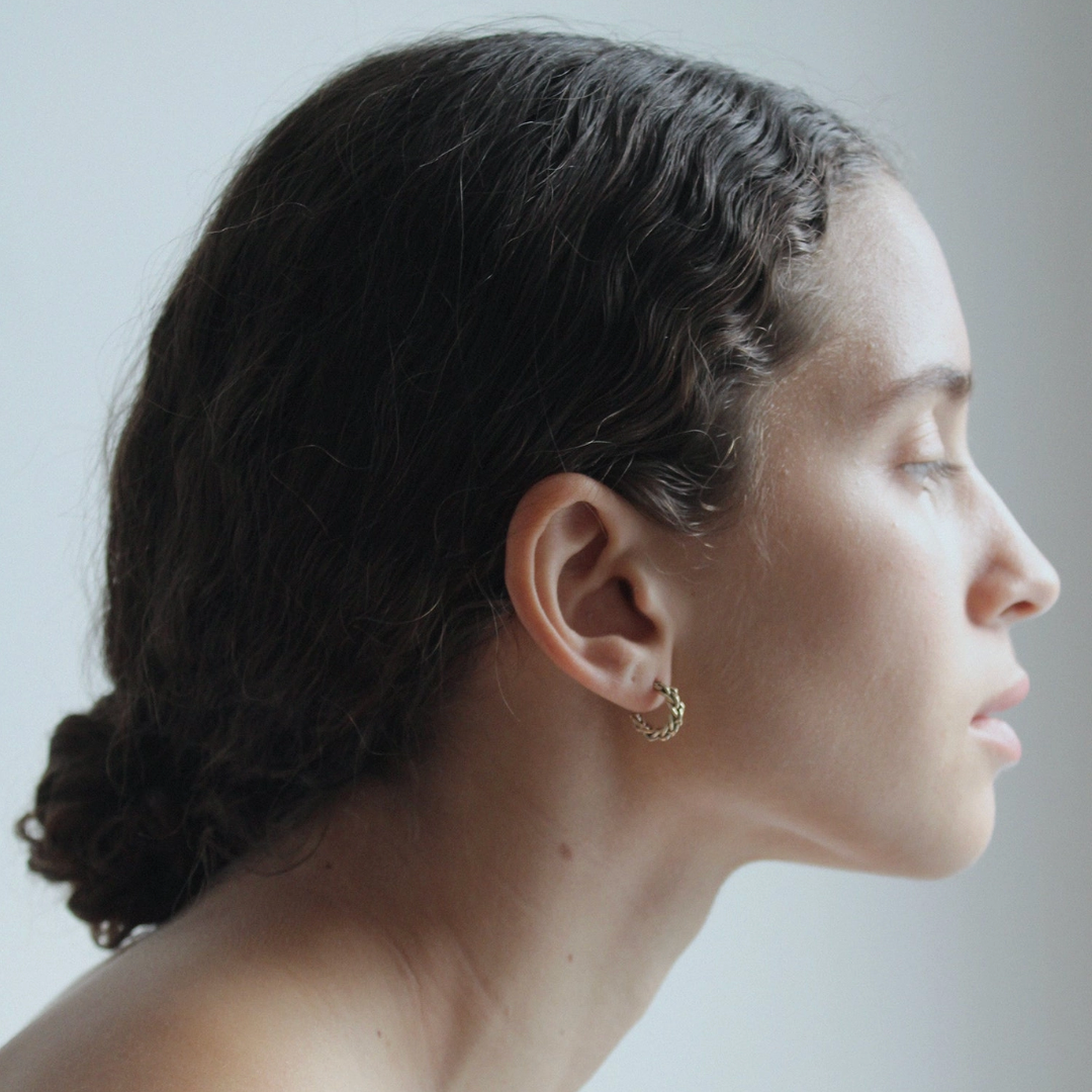 These delicate and perfect everyday hoops are braided by hand in soft wax and then cast into recycled gold. Hoops measure 5/8" in diameter, available in 10k or 14k yellow gold, with 14k posts and backs.