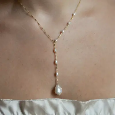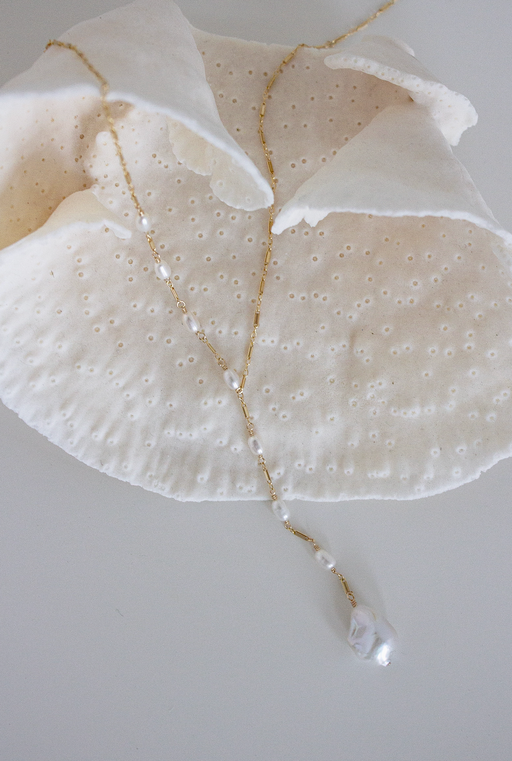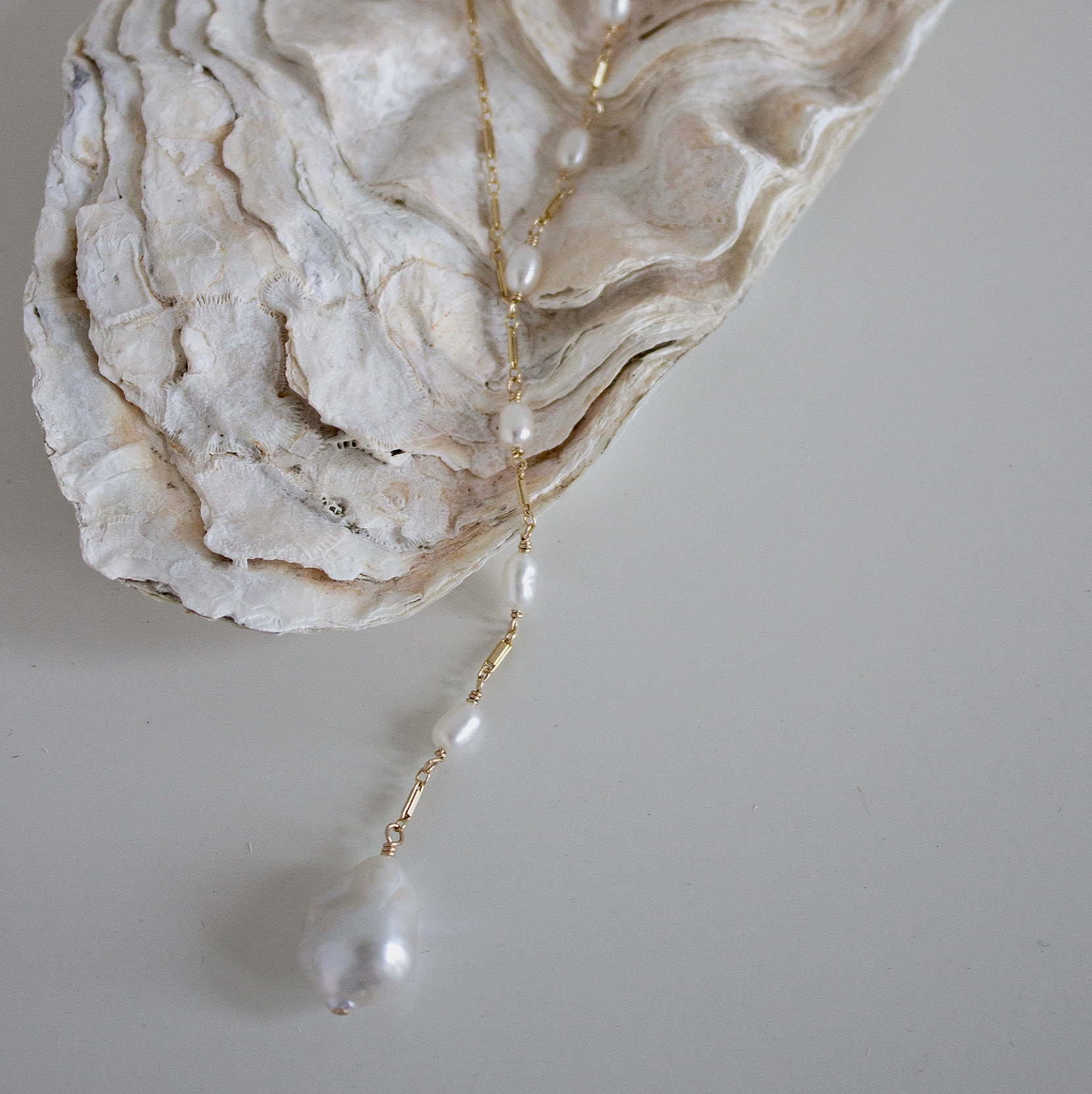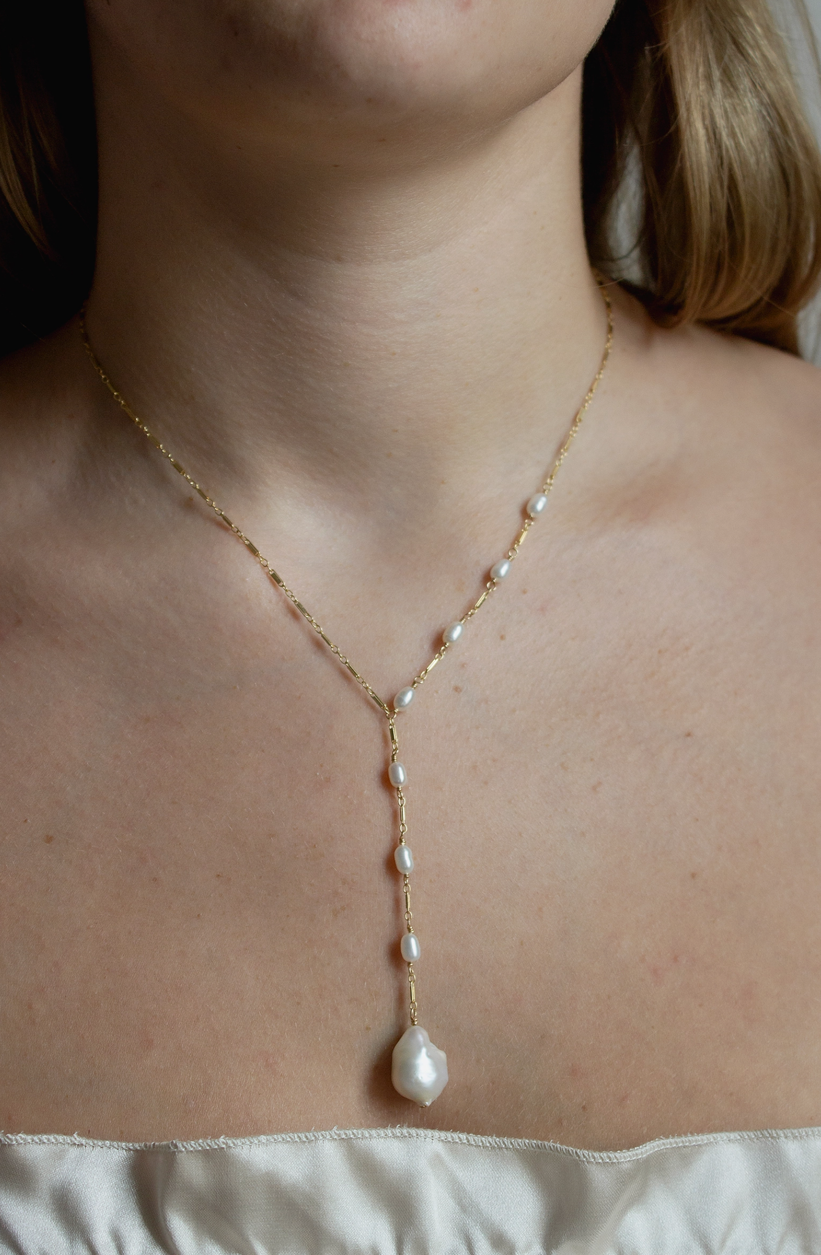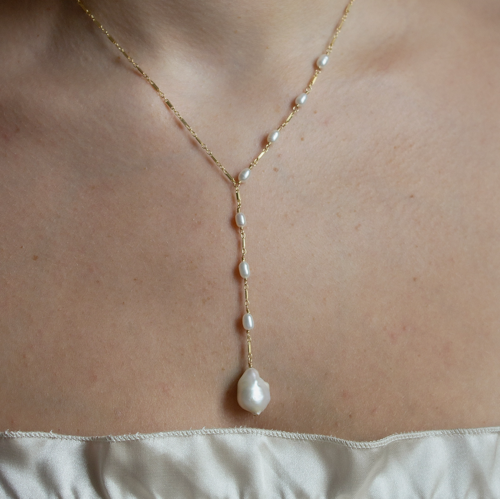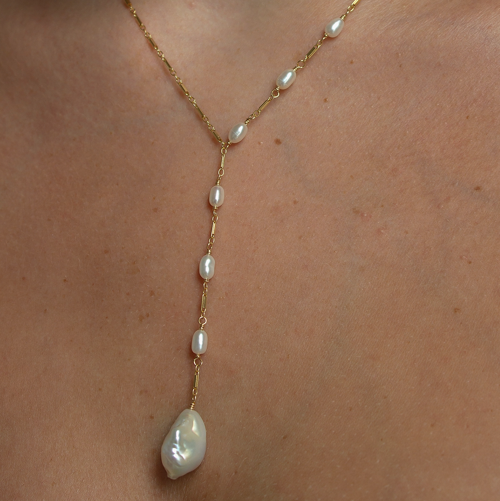 The Descending Perla Necklace is composed of natural white freshwater pearls and a unique chain that lead into into a baroque pearl pendant. Lightweight and easy to wear! Due to the nature of handmade, each one is slightly different and unique to you.