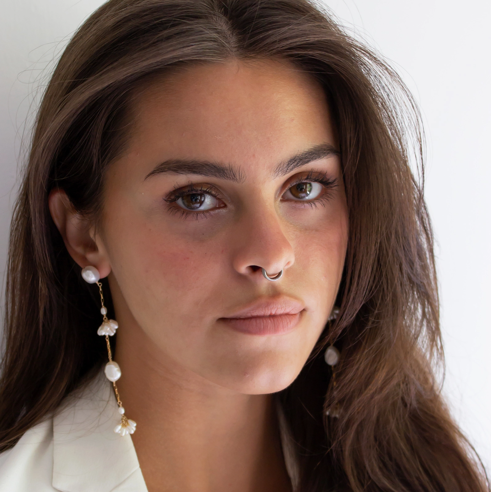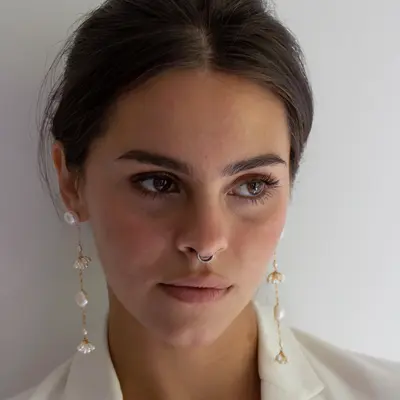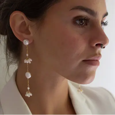 Statement worthy earrings call for the Long Fleurette Earrings. Composed of hand-fabricated "fleurette" freshwater pearl clusters dangling from 14k gold filled or sterling silver chains and baroque freshwater pearls. Baroque Pearl studs, these earrings are comfortable to wear. Love these with a strapless gown or simple slip dress!
