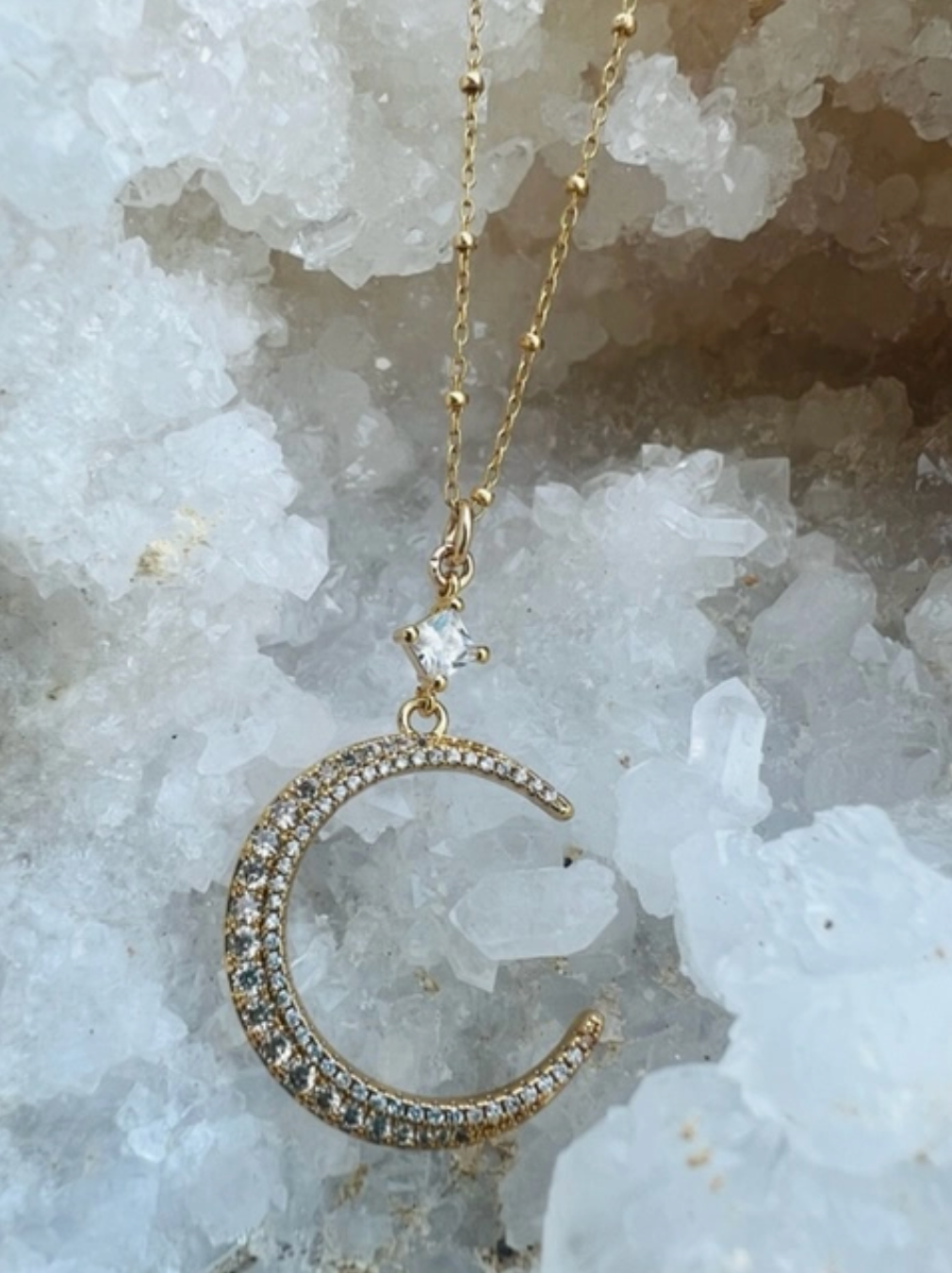 A bold crescent moon flecked with sparkling pave cubic zirconia hangs from another larger cubic zirconia, bringing celestial shine to this pendant necklace. The chain length is 18" with a 2" extender chain, making it the perfect showstopper for plunging necklines. Great for layering.