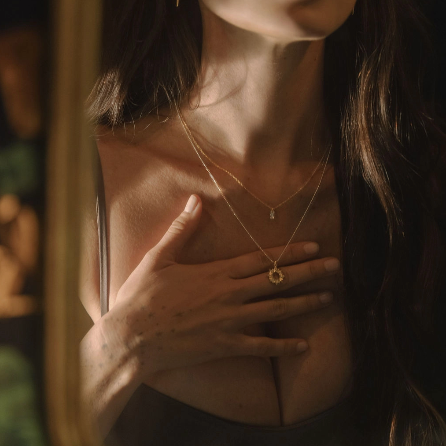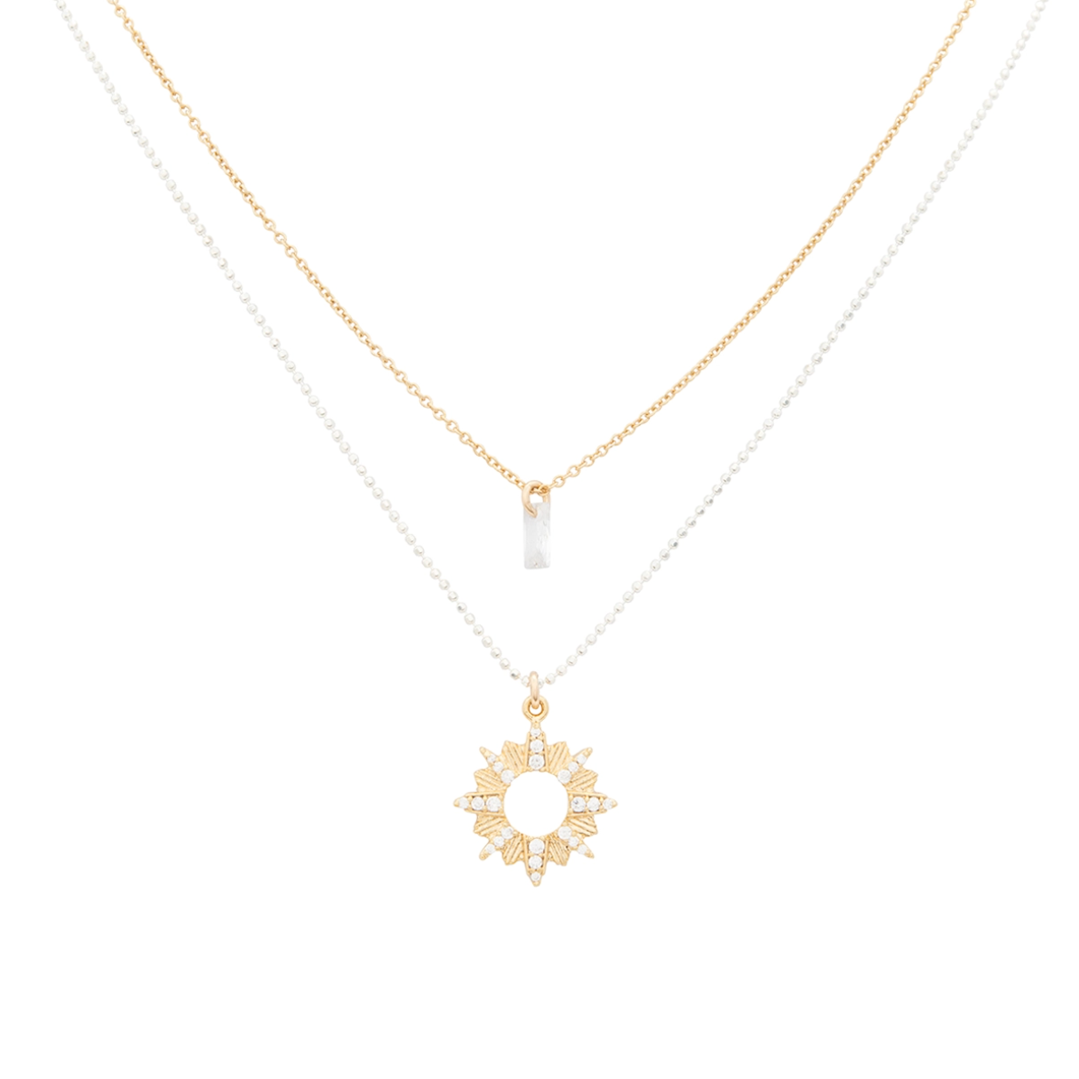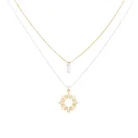 A baguette cut cubic zirconia crystal and a vintage inspired CZ charm brings beauty and sparkle to a gorgeous necklace designed with 2 layers of delicate chains. Mixed metal perfection.