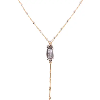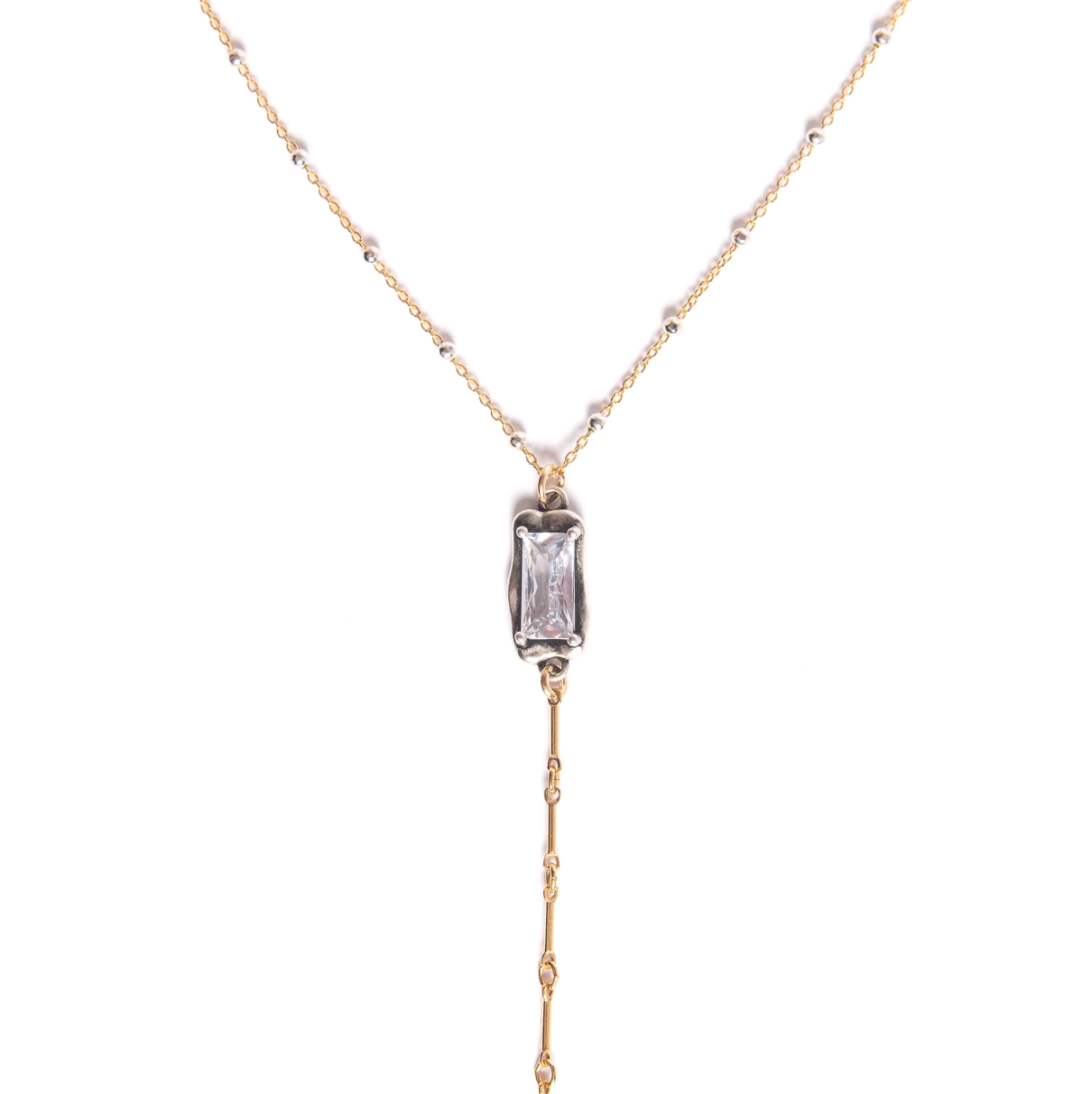A central molten sterling silver pendant displaying a sparkling cubic zirconia serves as the focal point of this elegant, mixed metal Y-necklace.