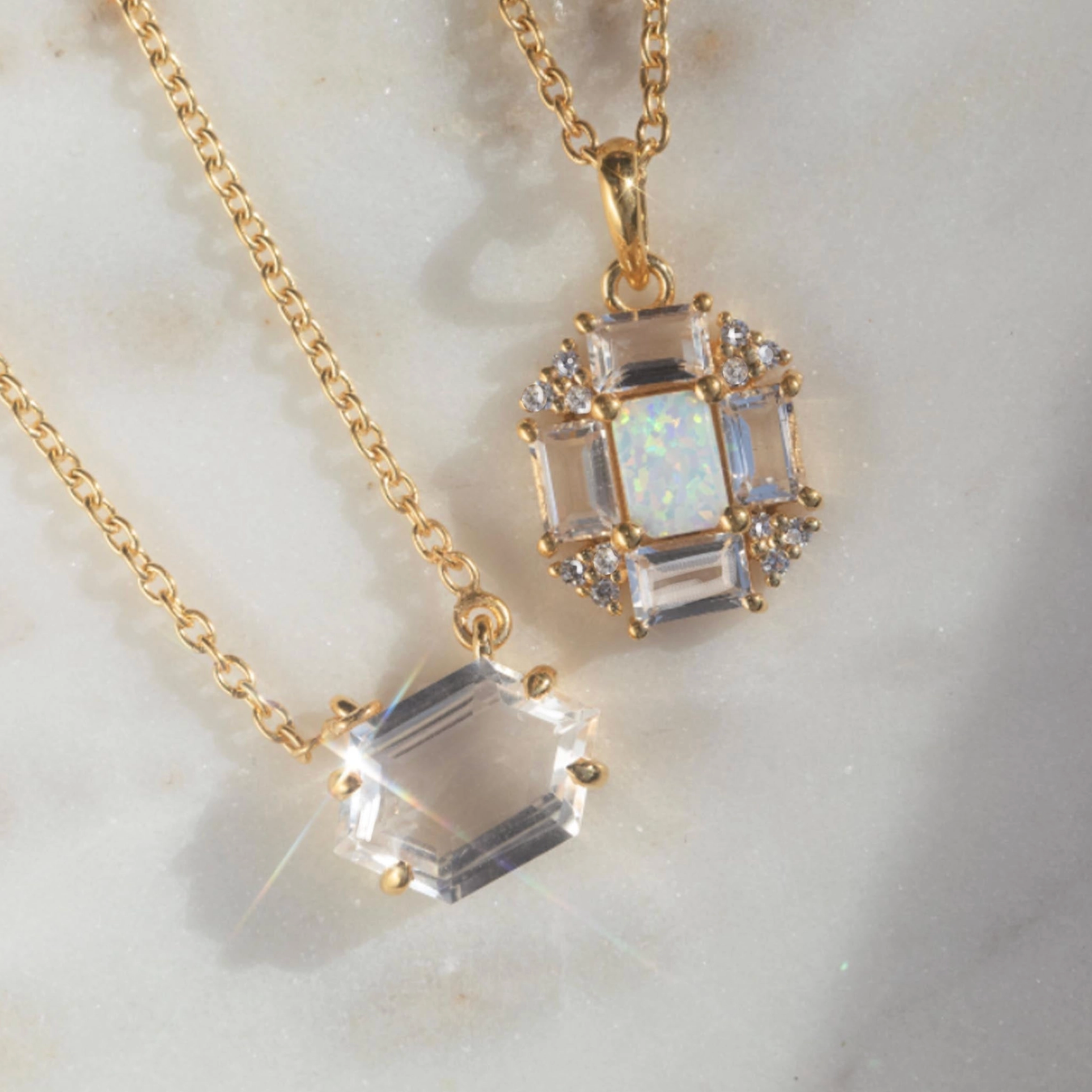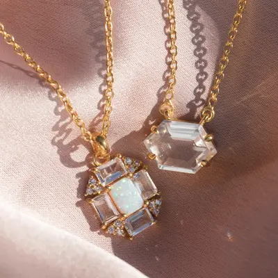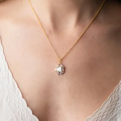A structured, Art Deco-inspired pendant featuring a celestial centerpiece of fiery opal, surrounded by a radiant halo of crisp white topaz baguettes. This "fire and ice" design captures the light with every movement, offering a mesmerizing glow that transitions effortlessly from day to night.