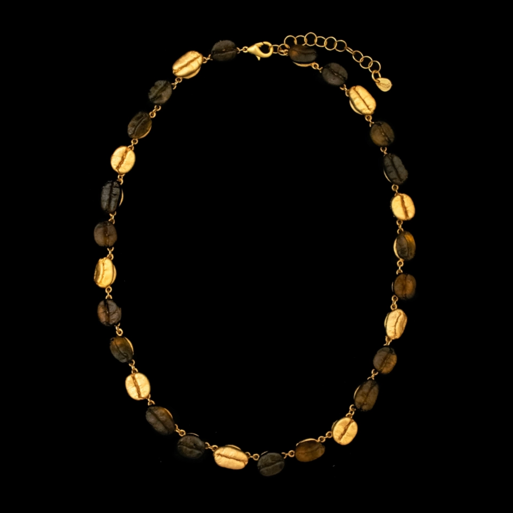Materials: The Roasted Coffee Bean necklace is cast in 24kt gold plated bronze and brown cast glass beans.