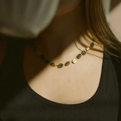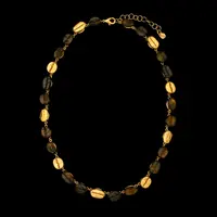 Roasted Coffee Bean collection is a beautifully balanced composition of natural form and refined finish. Alternating between warm brown glass and 24kt gold-plated bronze beans, the necklace is strung to create a rhythmic, tactile flow - rich in both color and meaning. The contrast between the translucent glass and luminous gold offers a subtle nod to the tones of freshly brewed coffee, making it a quietly striking piece for everyday wear or layered elegance.