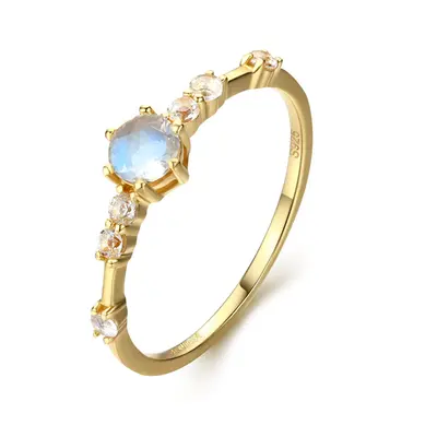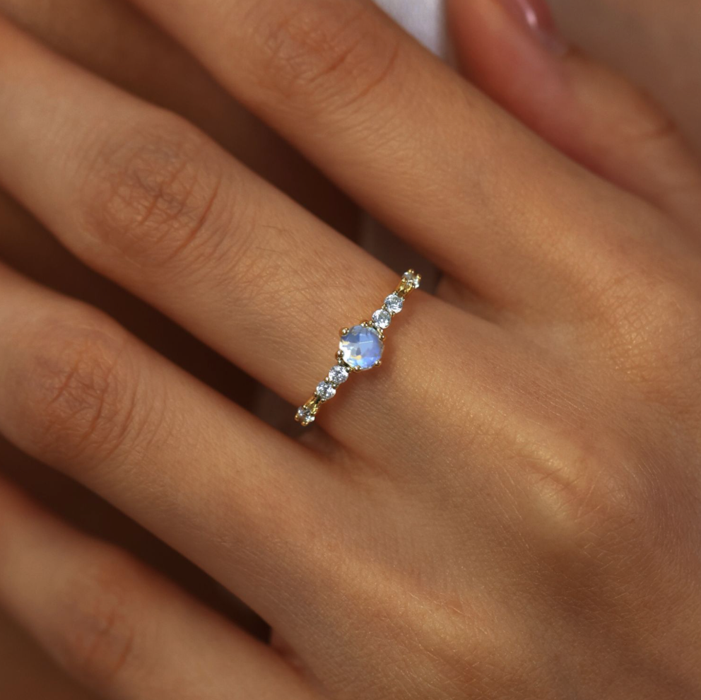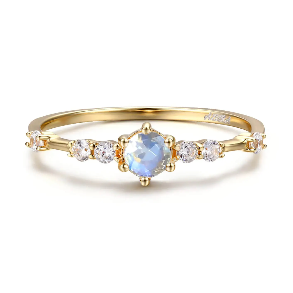 Inspired by the beauty of the universe, the dainty Center of the Universe Moonstone Ring reminds you of how precious you are, with an entire universe on your inside flowing with potential, energy, and with possibilities. This ring is made up of six equal-sized round gemstones revolving like a galaxy around a more prominent moonstone gemstone, made to sit at the center. A strikingly gorgeous piece to see you through the universe.